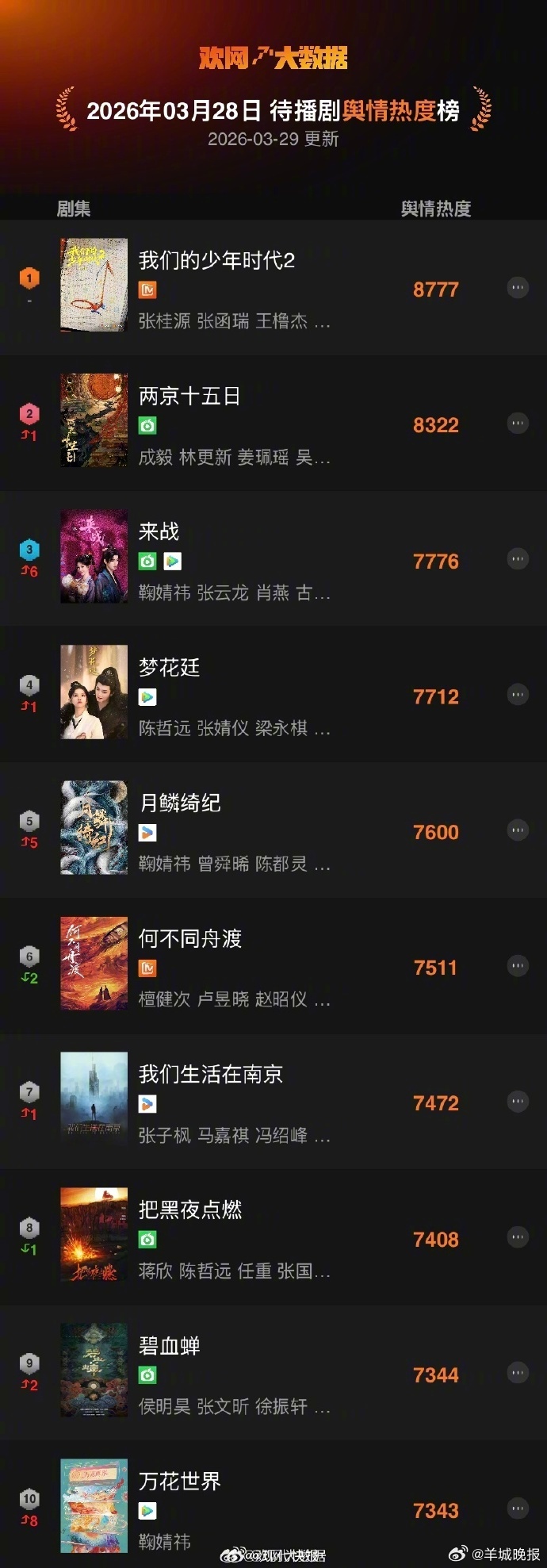 【#我们的少年时代2热度蝉联TOP1#】《我们的少年时代2》自2026年3月中旬官宣以来,以连续登顶多平台待播剧热度榜单的亮眼表现,成为当前最受瞩目的青春校园剧,其舆情热度峰值高达9078,位列年度待播剧热度榜第三,持续霸榜引发全网热议。据欢网大数据消息,3月28日待播剧舆情热度TOP10出炉!《#我们的少年时代2#》再次登顶。该剧由(排名不分前后,按年龄大小排序)主演,你期待吗?欢迎在评论区聊聊~~戳更多>>#单依纯承担全额版权使用费及赔偿##李荣浩说不需要赔偿##单依纯发长文回应##薛之谦因下雨演唱会免费##就这样 然后呢##李荣浩骂物业 传世经典#(编辑:郑宗敏;审签:艾渝)
