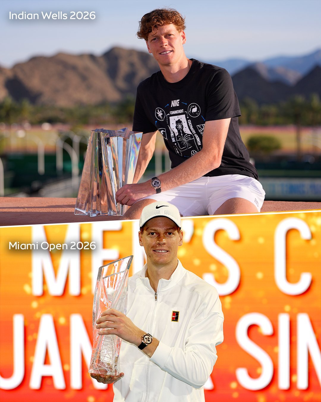 欢迎加入阳光双冠俱乐部!辛纳全场一发只丢两分,掐头去尾破掉莱赫奇卡的金身发球局,第一盘中段0-40落后,三个一发直得+2计Ace是全场精华。决赛有10个Ace入账,提前为红土赛季做好提档准备。辛纳从去年巴黎大师赛到今年阳光双赛,连胜34盘夺冠,成为历史第一人。单赛季阳光双冠历史只有8位男球员做到过;能企及次成就的女球员更少,只有5人 —— 这是超高端的俱乐部。然而,2026印第安维尔斯+迈阿密,萨巴和辛纳双双谱写新篇章,把硬地网球推向了全新的高度