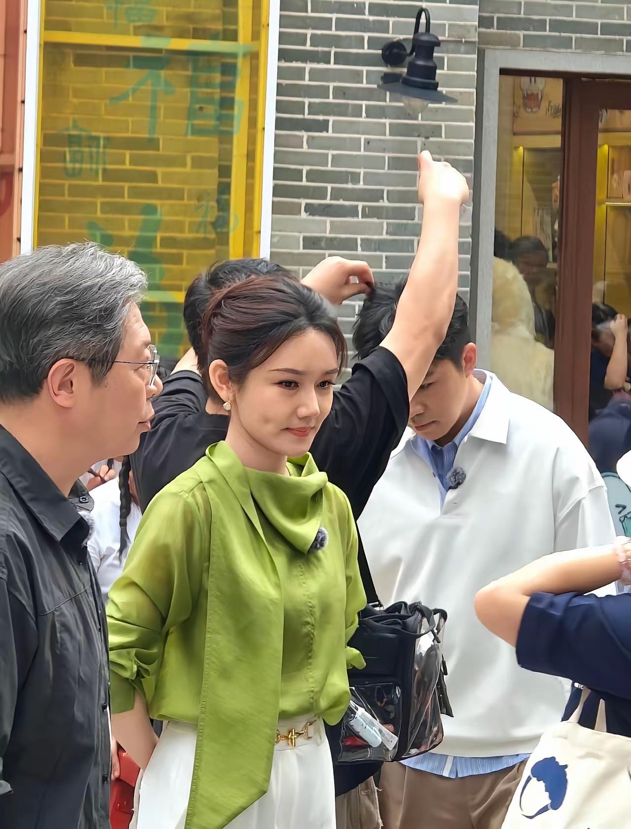 龙洋现身广州永庆坊录制节目,一身嫩绿衬衫搭配白裤清新又优雅。精致盘发搭配淡妆,笑
