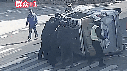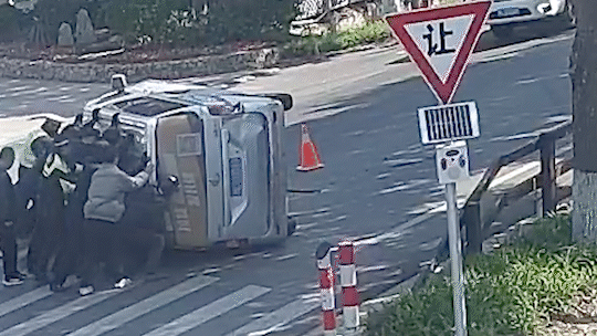 舟山普陀展茅路口,面包车侧翻后警民火速救援:先救人、再抬车,不到3分钟疏通道路,司机平安无恙!渔都街头,一双双援手就是最暖的风景👍舟山警民合力将侧翻面包车复位