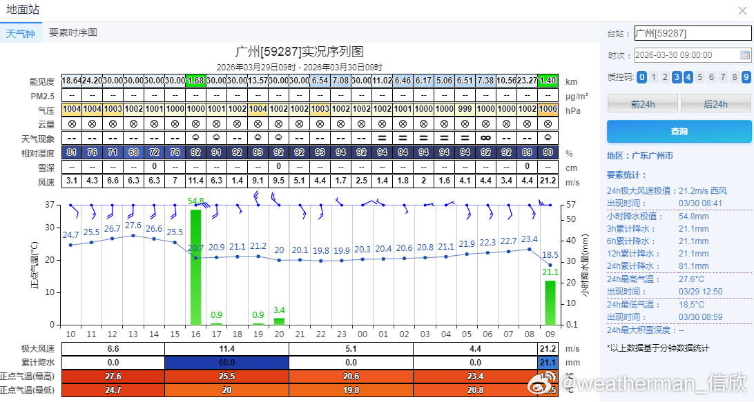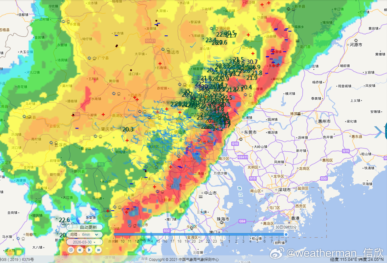 【飑线&广州强对流】广州今天8-9时出现了雷暴大风和短时强降雨——阵风9级(21.2米/秒),小时雨量21.1毫米。而且不仅是广州,从今晨到上午的雷达动画、降水、阵风观测看,带状的强回波,以及回波扫过后有不少大风、短时强降雨,这应该是一条飑线,而且正在东移。中山、东莞、深圳也即将出现强对流。