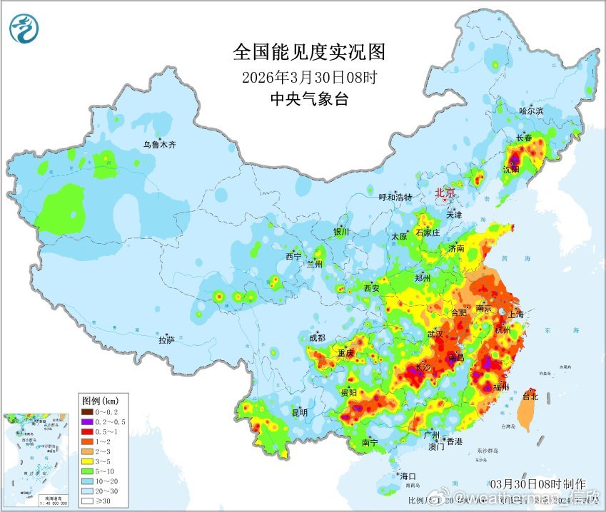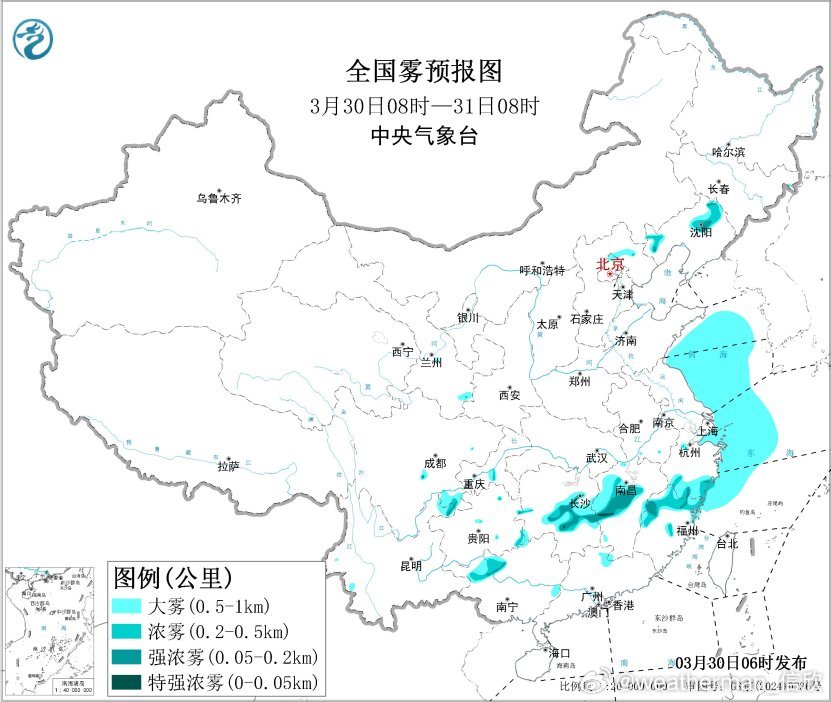预计,30日白天至夜间,黄海中部海域将有能见度不足1公里的大雾;30日早晨至上午,黄海南部海域、东海西部海域、江苏沿海、浙江沿海、福建北部沿海、长江口及杭州湾附近海域将有能见度不足1公里的大雾。此外,30日早晨至上午,辽宁中北部、重庆南部、湖南中部、江西中北部、浙江南部、福建中北部、广西北部等地的部分地区有大雾,局地有能见度不足200米的强浓雾。
