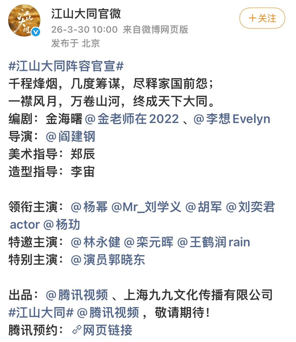 《江山大同》古装历史剧官宣领衔主演:特邀主演:特别主演:杨幂江山大同出发进组