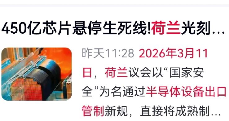 荷兰撕破脸加码光刻机管制!中国反手锁死其命脉,这一次,谁也别想拿捏! 全球化时代的科技博弈,从来没有单方面的霸权!2026年3月11日,荷兰彻底抛开商业底线,在美国施压下悍然扩大半导体设备出口管制,不仅继续封禁EUV光刻机,更将国内芯片产业赖以生存的28nm、45nm成熟制程DUV光刻机,纳入严苛审批,部分型号直接暂停出货,新规即刻生效,毫无缓冲余地。 要知道,国内超1500台ASML DUV光刻机,撑起了八成以上成熟芯片产能,荷兰此举直接掐断国内晶圆厂供货、维修、备件全链条,短短数日便造成巨额产能损失,妄图用一台光刻机困住中国科技发展的脚步。 但荷兰忘了,ASML傲视全球的光刻机,核心部件离不开中国独霸全球的中重稀土!我国掌控全球超98%的中重稀土精炼产能,没有中国稀土供应,再先进的光刻机也只是一堆废铁。中国向来秉持合作共赢,但绝不接受无端打压,此番精准反制,直击荷兰科技命脉,彻底打破其垄断幻想。 从来没有永远的霸权,只有互利共赢才是长久之道。荷兰甘当马前卒,最终只会自食恶果,而中国,早已在封锁中练就破局之力,任何打压都挡不住大国科技崛起的步伐! 对此,你怎么看? 光刻机管制 中荷科技博弈 中国稀土反制 芯片产业突围