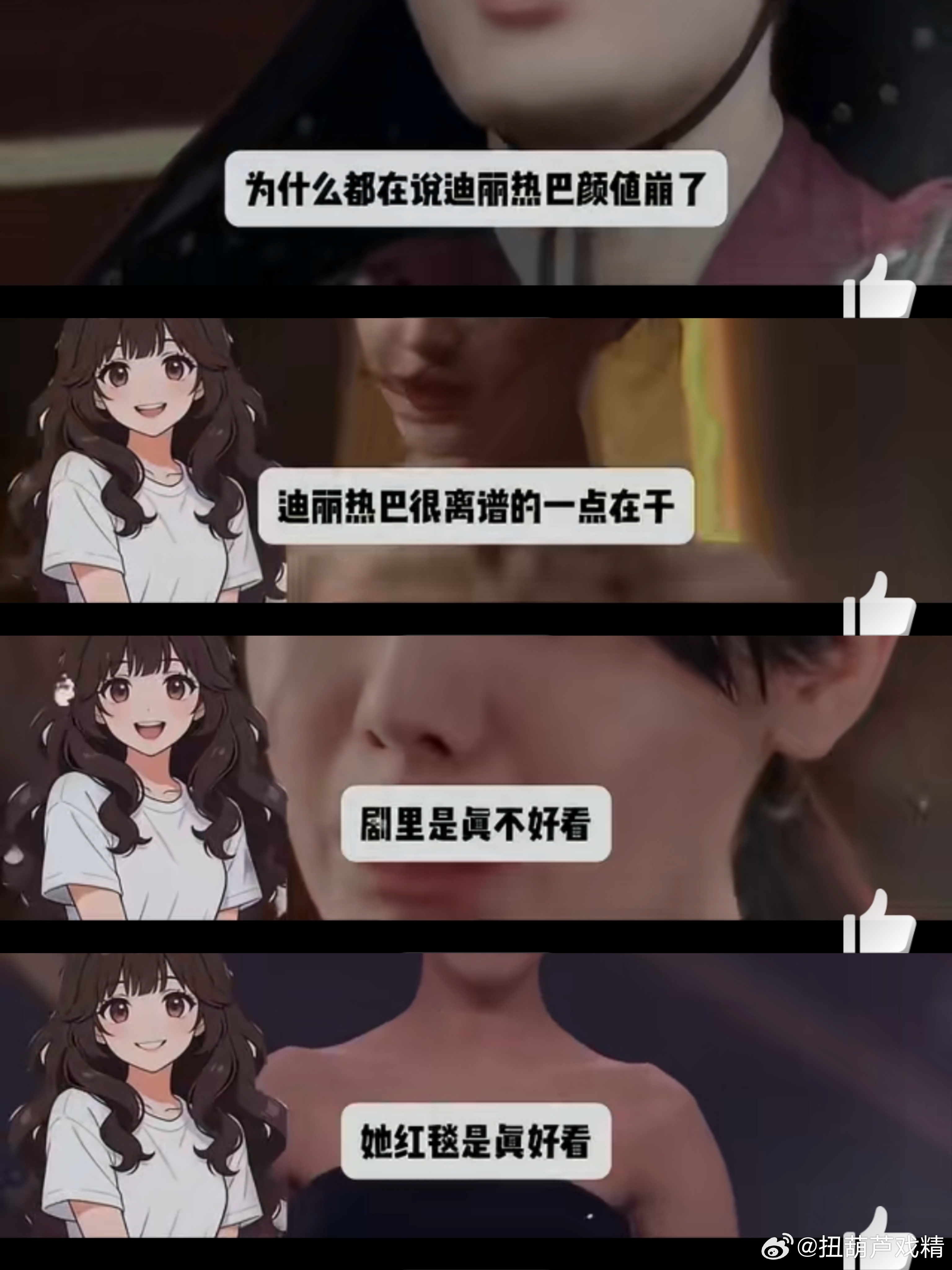 巴巴有些角度是很美,但在剧里死角就,特别是一做大表情,整张脸五官都扭成一团,这一点和z一毛一样。这就是网友说红毯是真美,在剧里就,因为红毯不需要大表情啊
