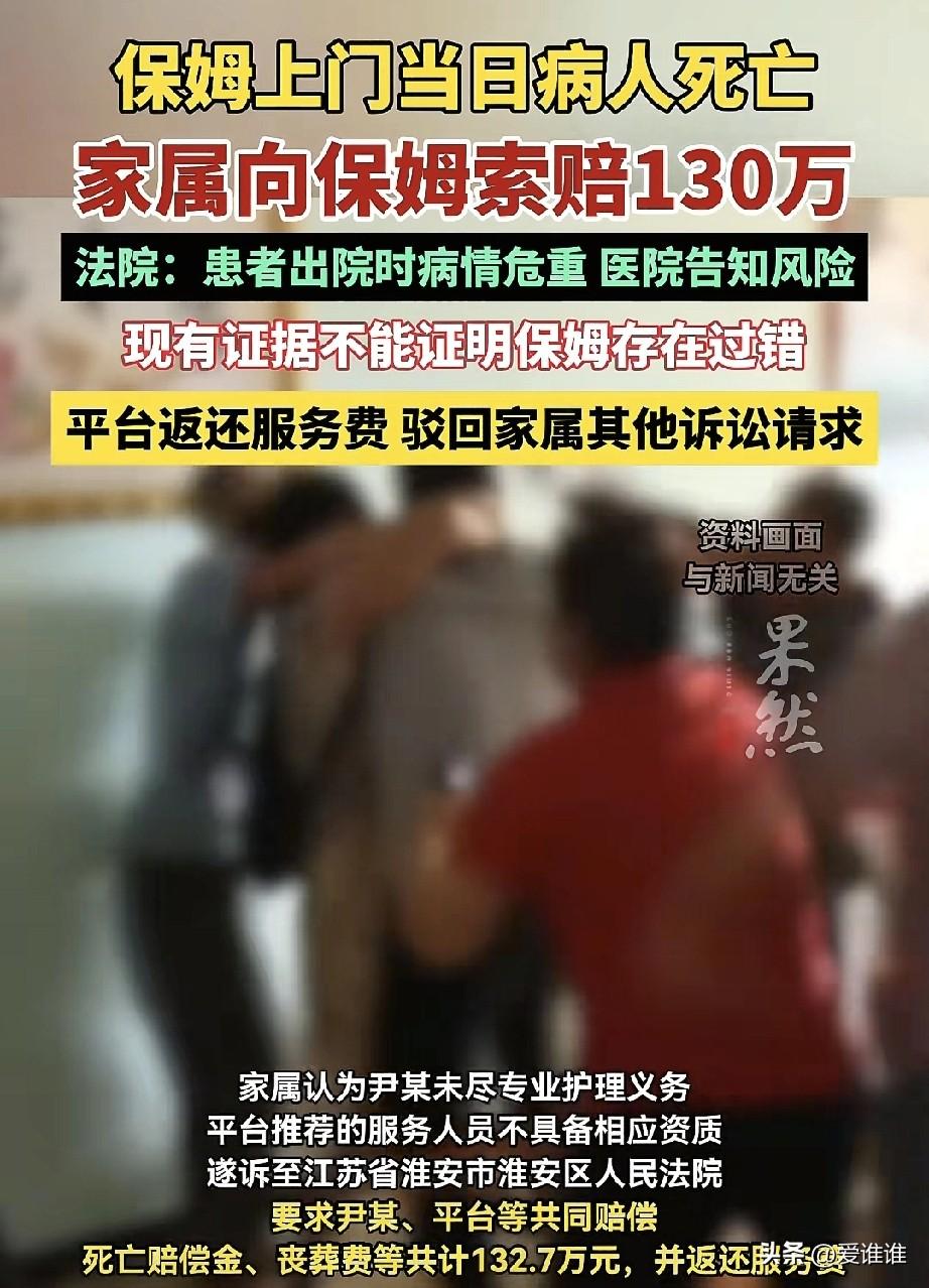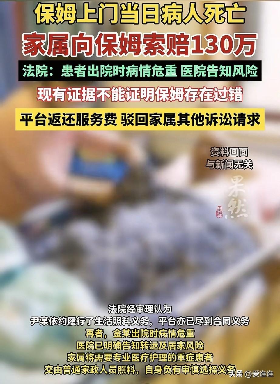 男子脑干出血成了植物人,家属把他接回家找了个保姆照顾,没想到保姆照顾不到一天男子就去世,家属认为是保姆的过错,要求她赔偿132万,法院审理后认为,你这不是胡闹吗! 2024年5月,江苏淮安,金某因为脑干出血,在医院躺了很久,一直昏迷不醒,身上插满管子,病情一点不见好转,家里人天天守着,看着医药费越来越高,实在撑不住了,到了5月8号,一家人商量之后,咬着牙决定把病人接回家,不是治好了,是实在住不起了,也看不到什么希望。 金某回家后还是昏迷不醒,完全离不开人,家人轮流照顾,个个累得受不了,就想着请个人帮帮忙,5月11号,他们通过一家家政平台花了7300块钱找了个住家保姆,合同在手机上签的,写明了服务内容是打扫卫生、照顾老人或病人。 第二天,保姆尹某来了,她五十来岁,进门后看了看躺在床上一动不动的金某,就开始干活,她先端温水给金某擦身子,又从头到脚给他按摩,想着人在床上躺久了,按摩按摩能舒服些。 可到了下午,金某突然就不行了,家里人跑过去一看,人已经没了气息,虽然金某之前跟植物人差不多,可到底还有口气在,现在人突然走了,家人接受不了。 悲痛之后,他们把气撒在保姆身上,怎么一按人就没了?他们一查,发现保姆没有护理方面的资质,更觉得平台也有责任,把一个没资质的人派来照顾重症病人。 一怒之下,家属把保姆尹某和家政平台一起告上法院,要求赔偿死亡赔偿金、丧葬费等一共132.7万元,还要退回7300块钱服务费。 法院审理后认为,合同上写的“照顾”指的是生活上的照料,比如擦洗、翻身、喂饭这些,并不是专业的医疗护理,保姆给金某擦身体、按摩,都属于合同约定的正常服务范围,而且没有证据证明她的操作有什么不对,更没法证明金某的死跟她按摩有直接关系。 至于平台,法院查实平台对保姆的资质做过审核,合同里也写明了服务内容,该尽的义务都尽到了,反而是家属把重症病人交给一个普通家政人员照料,自己没尽到审慎选择的责任。 法院认定,保姆和平台都没有违约,不用承担赔偿责任,只同意平台把7300块钱服务费退了,其他索赔请求一概驳回,家属不服,提起上诉,二审法院还是维持了原判! (2026年3月29日,今日说法报道)