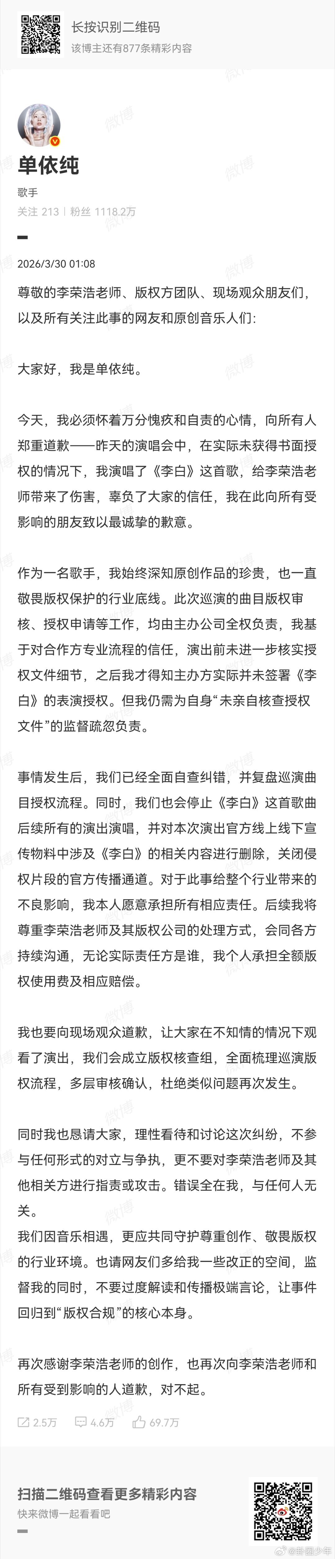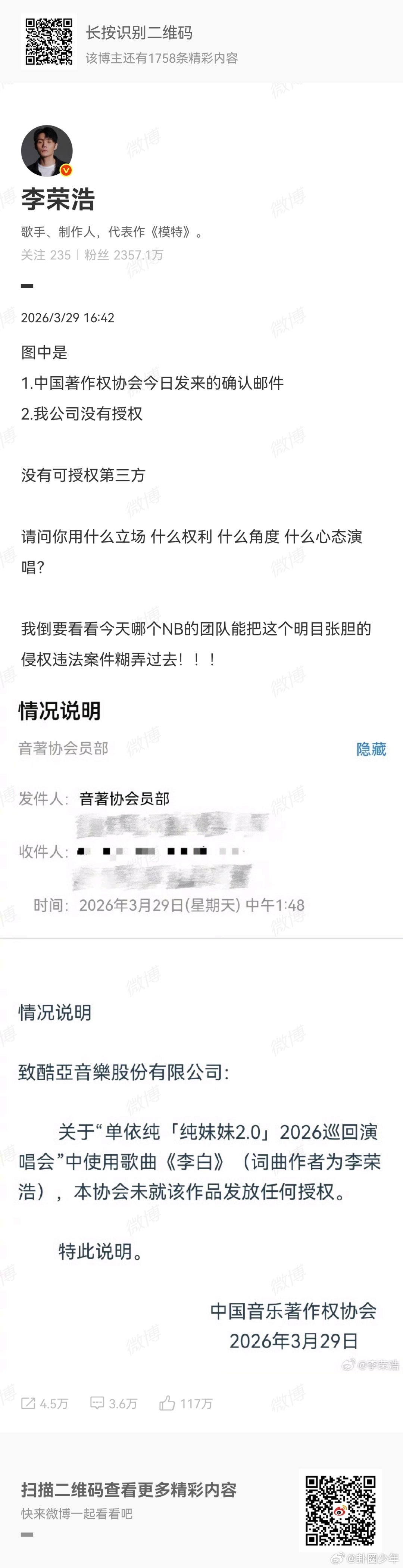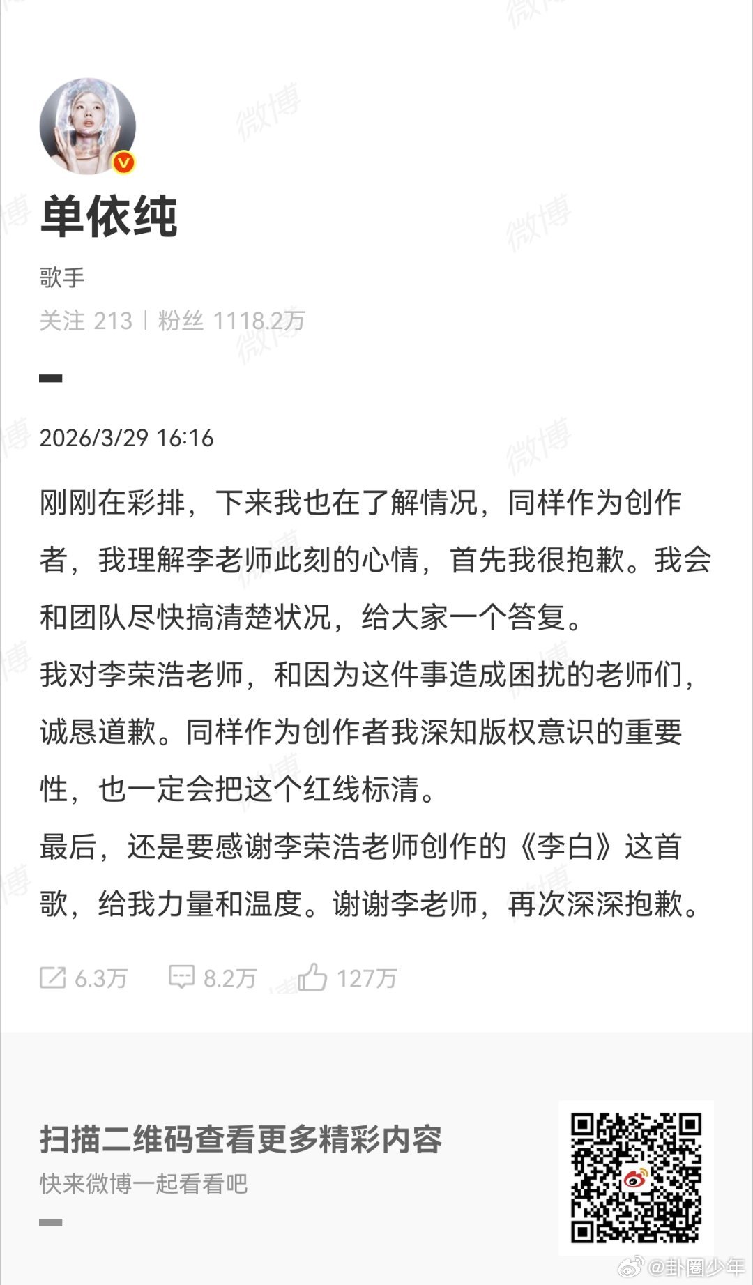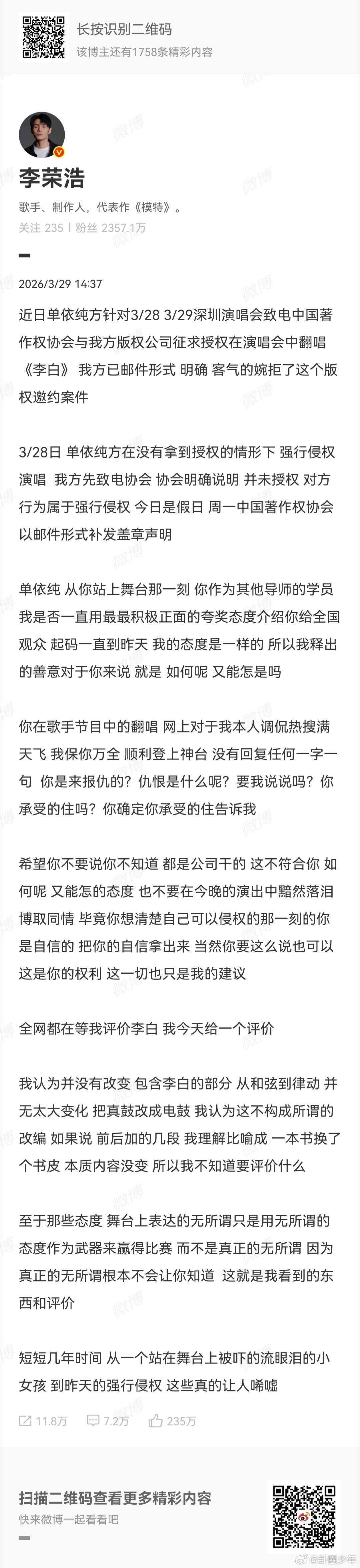 李荣浩是不想让单依纯唱李白吧李荣浩真的只想要一个道歉李荣浩在单依纯道歉后回应无需赔偿,其此前拒绝授权、事后不索要赔偿的行为,引发网友对其真实诉求的猜测与讨论。