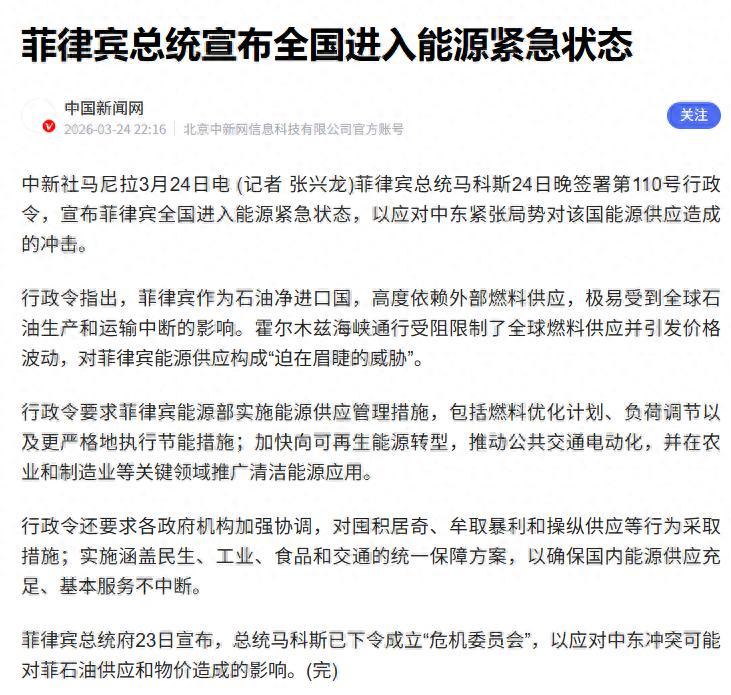 菲律宾彻底破防,近日已经陷入能源荒的绝境!更令人震惊的是,它成了全世界第一个因为能源短缺而紧急宣布进入紧急状态的国家,整个国家都在面临“油荒”的致命难题,举国上下人心惶惶! 全球首个被能源难题逼到全境拉响紧急状态的国家,已经出现在大众视野里,菲律宾这次直接把能源危机摆到了全世界面前。 很多普通人觉得这事儿离咱们日常很远,其实里面藏着不少和民生物价、资源储备相关的干货,看懂整件事,就能摸清当下全球能源链条有多脆弱。 菲律宾高层前不久敲定相关政令,整个国家正式进入能源紧急管控模式,这也是目前全球第一个走到这一步的国家。普通人难免好奇,好好的民生局面,怎么突然卡在能源环节动弹不得? 中东关键航运通道通行受阻,大量运油船只没法正常往来,国际原油价格一路走高。菲律宾本土压根挖不出足够油气资源,全国日常用油、发电用料几乎全都靠进口补给,碰上这种行情波动,最先扛不住压力也在情理之中。 当地老百姓已经实打实感受到生活压力变大,不少加油站直接关停停业,还在营业的站点燃油价格直接翻倍上涨。居民家里缴纳的电费跟着上调,每个家庭每月固定花在能源上的开销,一下子多出一大截。 燃油成本走高之后,所有生鲜食材、日用商品的运输成本都会增加,菜市场、街边小店的物价跟着稳步上浮。普通上班族、低收入群体过日子变得精打细算,日常出行、买菜做饭都要处处省钱,生活幸福感明显下降。 菲律宾之前一直指望合作盟友能伸出援手,帮忙稳住石油供应缺口,到头来也没拿到实实在在的物资帮扶。外部供油渠道还在不断收紧,俄方敲定四月起暂停对外供应汽油,让本就紧张的供油局面雪上加霜。菲律宾能选择的进口货源本来就不多,关键渠道再受限,国内现有的能源储备根本撑不住长期消耗,短期应急之后依旧会陷入短缺困境。 多数人不清楚菲律宾真实的能源家底,这个国家原油几乎完全依赖外来进口,绝大部分货源都来自中东地区。平常国际市场平稳的时候,这种采购模式看不出太大隐患,只要航道通行、出口政策出现变动,国内整条供需链条马上就会紧绷起来。 本土新能源开发进度缓慢,风能、太阳能这类替代能源,没办法补齐日常巨大的能源消耗,现有储备油量只能支撑短期周转,应对不了突发的市场波动。 跳出菲律宾这件事本身,再看东南亚区域就能发现很多冷门事情。这片区域不少海岛国家,能源架构都和菲律宾高度相似,自身没有优质化石能源储备,日常运转全靠外部输送资源。 之前就有小众东南亚国家遇到天然气短期供应波动,当地加工厂停工减产,居民日常用气限时分配,正常生活节奏直接被打乱。只是这类事件曝光度不高,很少被大众熟知,却能印证单一能源渠道存在的巨大隐患。 咱们普通人也能从这件事里读懂简单的道理,不管是一个国家,还是咱们普通家庭,手里留有充足储备,多准备几条稳妥后路,遇到突发状况才不会慌慌张张。 一个国家要是把生存发展的核心资源,全都寄托在别人身上,行情平稳的时候看不出问题,外界局势稍有变化,最先受到影响的永远是基层老百姓。能源从来不是单纯的国际新闻噱头,它和油价涨跌、电费调整、菜市场菜价紧密挂钩,最后都会落到每个人的生活账单里。 如今菲律宾深陷的能源困境,也给所有依赖外来资源的地区敲响警钟。只靠固定渠道进货,本土又没有配套产能,早晚都会埋下不稳定的隐患。当下全球能源市场一直处在动态变化里,各国随时会调整出口规则,关键航道也容易出现通行阻碍,提前搭建多元供货渠道,深耕本土替代能源发展,才能长久稳住民生基本盘。 普通百姓看懂整件事,也能明白日常物价浮动、油价涨跌从来都不是单一原因造成。全球能源供应链环环相扣,一处出现变动,层层传导之后,最终都会影响到普通人的柴米油盐。认清这份底层逻辑,既能看懂国际大事,也能看懂身边日常开销变化的根本缘由! 信源: 央广网--俄罗斯将从4月起禁止汽油出口--2026.03.28 Hi科普啦--能源断供引爆危机,菲律宾急了,马科斯没找美国,慌求中俄救场--2026.03.27 上观新闻--率先拉响能源警报,菲律宾“扛不住了”?--2026.03.26