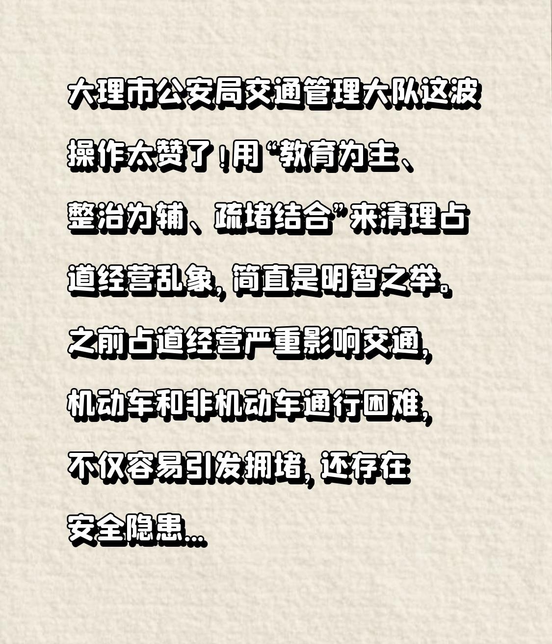 大理市公安局交通管理大队这波操作太值得称赞了![赞][赞][赞] 以“教育为主、整治为辅、疏堵结合”的方式来整治占道经营乱象,着实是明智之策。 此前,占道经营严重影响交通,机动车和非机动车通行艰难,不仅极易引发拥堵,还存在安全隐患。之前去大理旅游,就遇到过街道被摊贩挤得水泄不通的状况,车辆根本无法正常行驶,就连骑电动车都得格外小心。 如今进行集中清理,能够让道路恢复畅通,保障大家的出行安全。期望这种治理行动能够持续开展,让大理的交通环境日益改善,也让游客和居民都能拥有更惬意的体验。