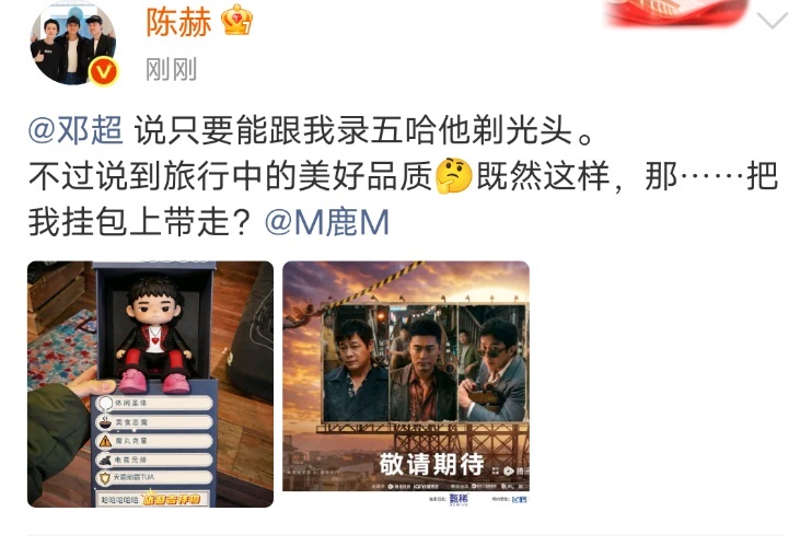 邓超陈赫隔空喊话陈赫喊话邓超鹿晗五哈官宣当天,邓超陈赫的隔空互动欢乐不断,互相提及为节目做出的可爱承诺,笑点拉满。陈赫还顺带调侃鹿晗,开玩笑要把他挂包上带走,这样温馨又搞笑的三人组合,让人迫不及待想看到五哈6正片。
