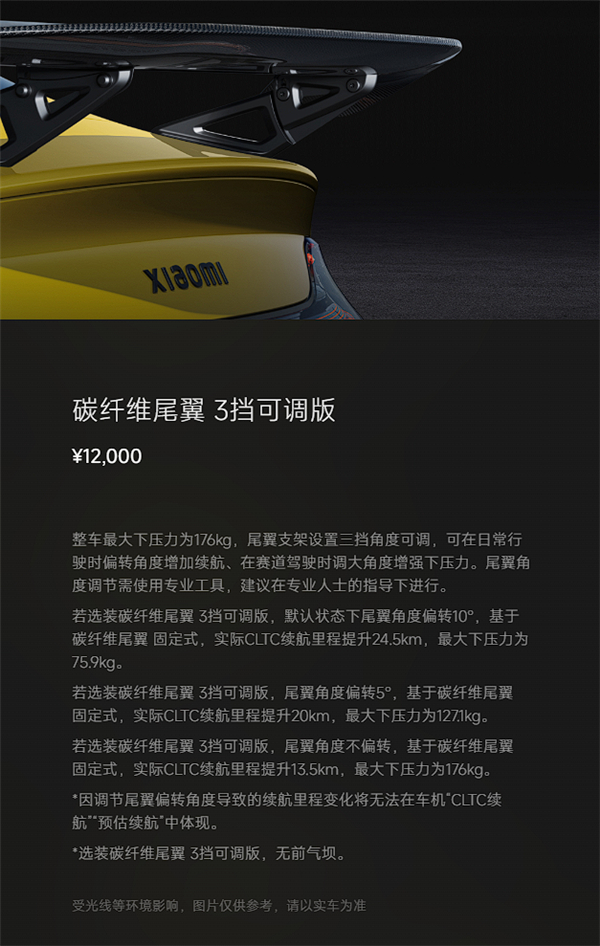 三档可调碳纤维尾翼(1.2万元):专业级空气动力学套件,支架支持三角度调节以平衡续航与下压力:10°偏转:续航+24.5km,下压力75.9kg(日常经济模式)5°偏转:续航+20km,下压力127.1kg(均衡模式)0°(不偏转):续航+13.5km,下压力176kg(赛道极限模式)注:角度调节需专业工具,官方建议由专业人士操作。