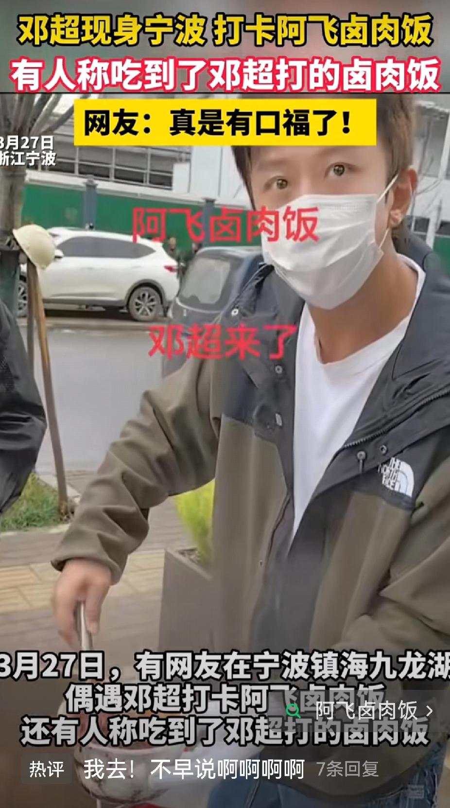 邓超现身宁波镇海,打卡网红卤肉饭 邓超是我喜欢的影星,性格热情开朗,很帅又多才多艺。前两天有网友在宁波镇海九龙湖附近偶遇邓超。 邓超特意去了宁波镇海一家在工地上摆摊的阿飞卤肉饭,据说价廉美味,因一位贵州工友“埋怨式”夸赞而走红网络。这次邓超还特意在卤肉摊位前为工地工人们打饭,大家称真有口福。 看来宁波魅力十足,最近招了很多明星过来打卡。
