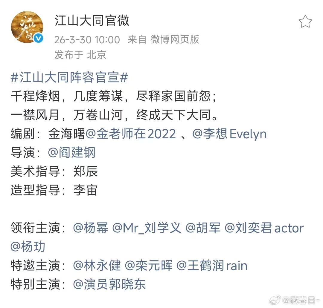 杨幂江山大同一番江山大同番位这部剧很明显的女本位啊,杨幂就是毋庸置疑的大女主,没有什么好争议的,而且之前传的瓜也都是男生,杨幂从来没变过