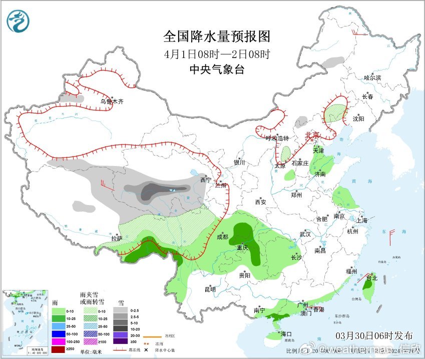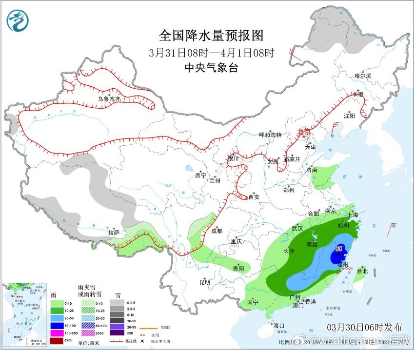 预计3月31日08时至4月1日08时,江南大部、华南北部等地部分地区有中到大雨,其中,浙江南部、福建北部等地部分地区有暴雨(50~80毫米)。