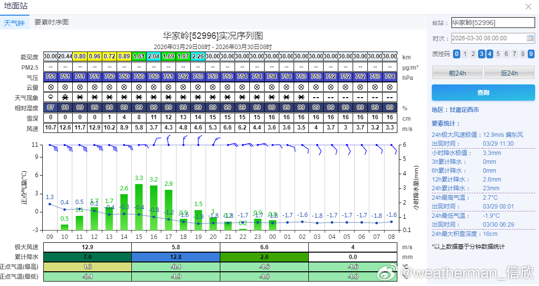 【降水】昨天到今晨,青海东南部、甘肃南部、内蒙古东北部、黑龙江北部等地出现明显降雪。甘肃华家岭出现大暴雪,今晨积雪16厘米。南方地区出现大范围对流降雨,华南暖区对流超预期,截留水汽,导致强降雨区偏南。广西容县、玉林、岑溪、上思、博白、广东云浮、广州、德庆、佛山南海、郁南等站点出现暴雨。