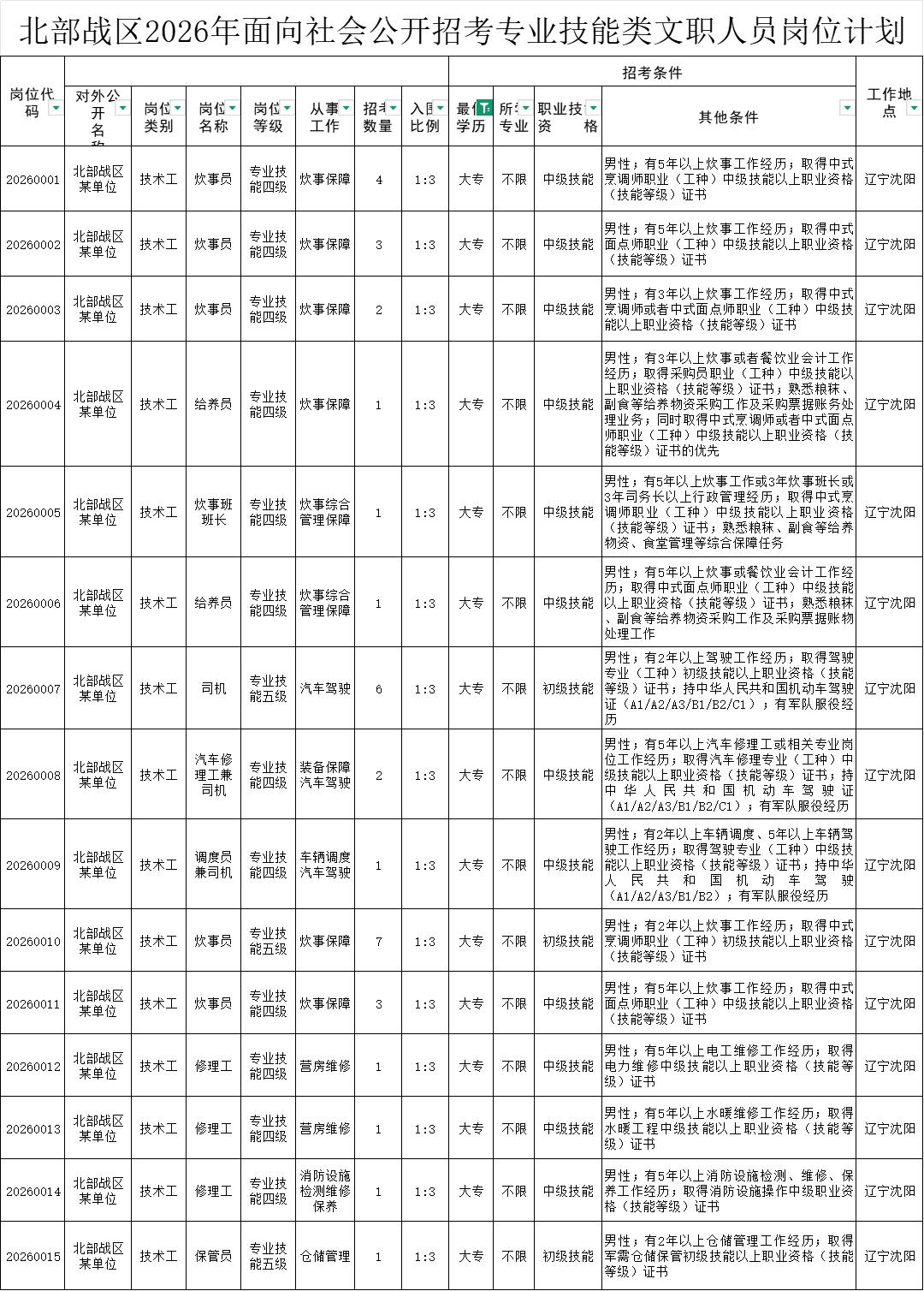 进入了一个不看学历看能力的时代!做饭的做的好,也可以吃了国家‘皇粮’了;司机和维修工之前也感觉到在社会群体比较低,感觉抬不起头,但是现在可以抬起头了! 刚刚北部战区发布了面向社会公开招聘文职技能岗的公告,招录人数35人,炊事员:20人(最大招聘群体),司机/汽车修理工:9人,修理工:3人,其他岗位:3人,总计35个岗位,可以说非常给力,这次主要集中大专学历即可报名,当然很多要求有工作经验,这对具有专业技能的人来说,太好的消息了,毕竟我们知道这样的可以拿到‘军饷’不是每一个人都可以得到,只要你技能过硬,符合条件去报名,就可以获得你想要的人生,你在小餐馆做饭也是做饭,但是你到军区做饭,那感觉是不一样的,成为了保护祖国的一份子,给战士提供营养,是为国家奋斗的直接参与者,这绝对是一个好的职业! 符合条件的朋友,可以留意下这条公开招录信息,不要错过这样的好机会!