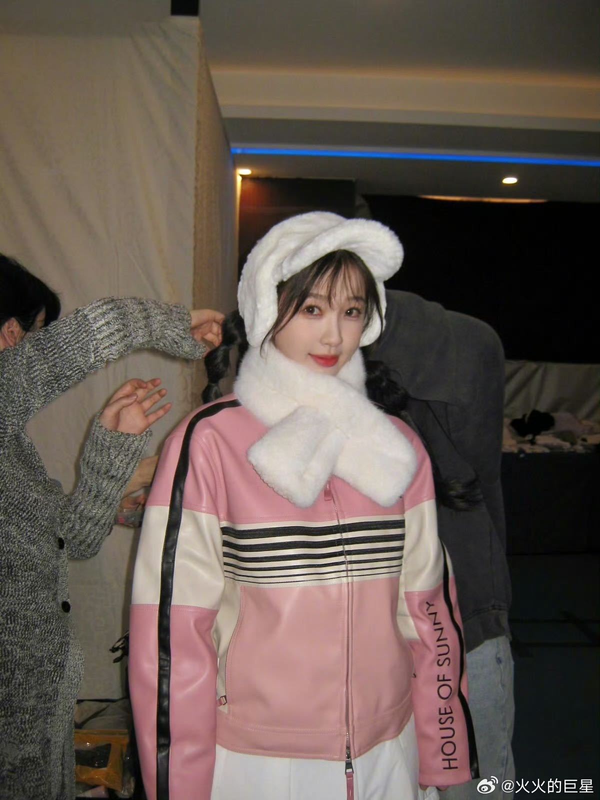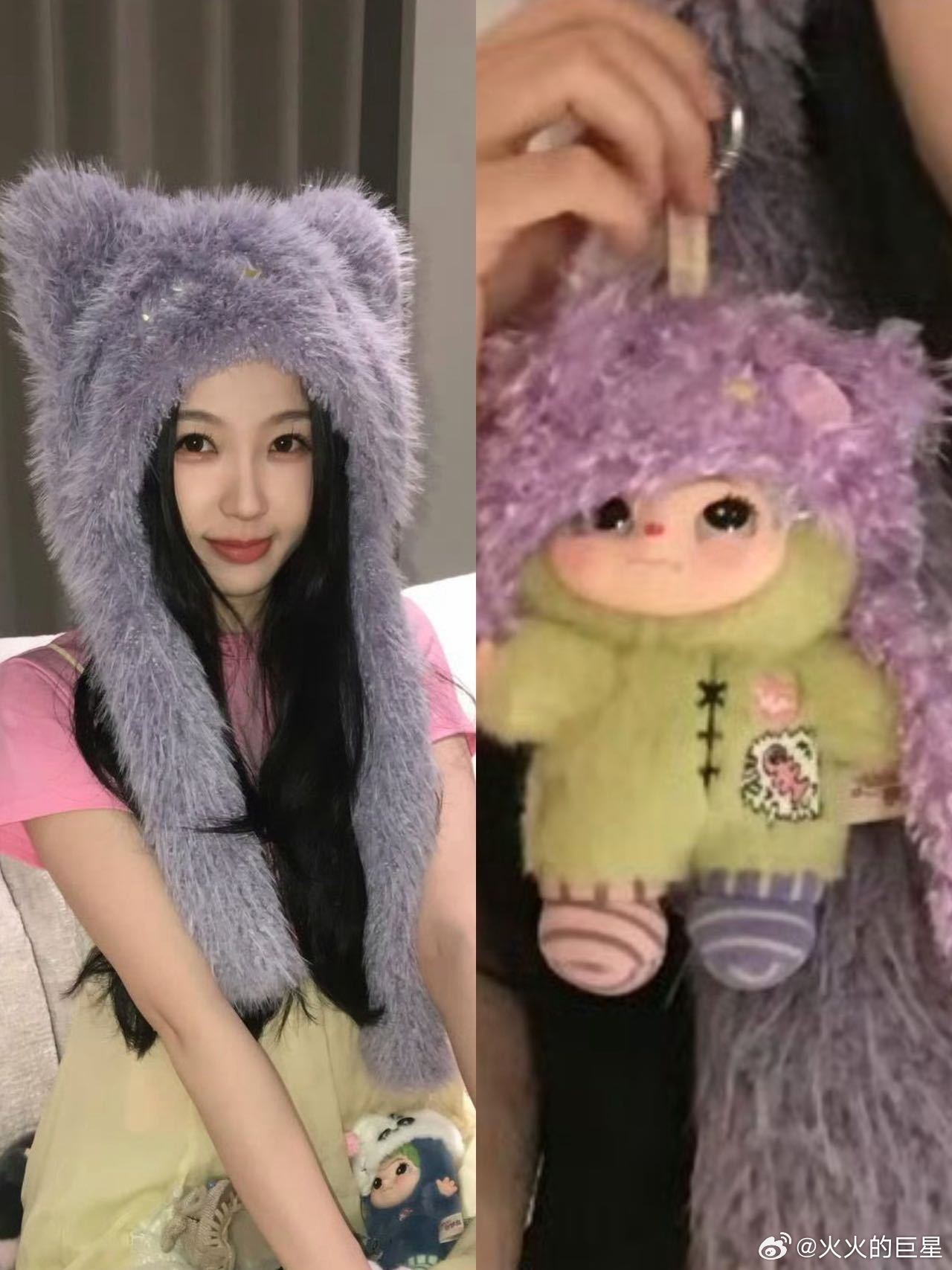 虞书欣和wakuku同款帽子虞书欣戴了 WAKUKU 同款紫色毛绒帽子,怀里还抱