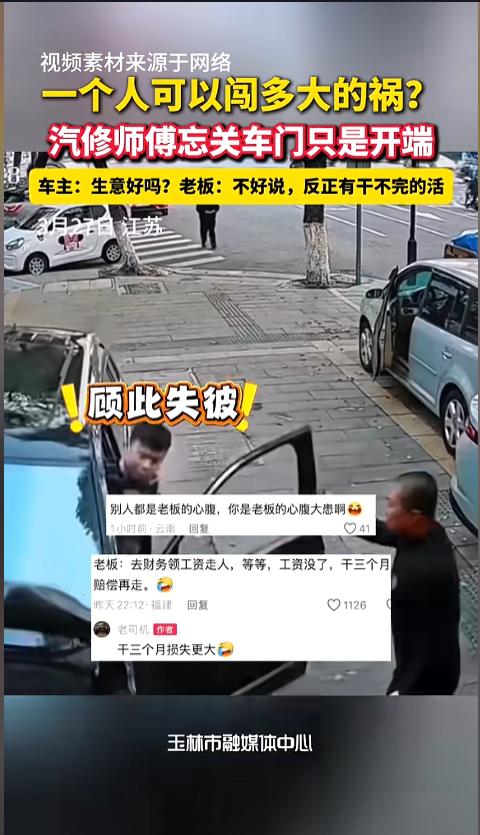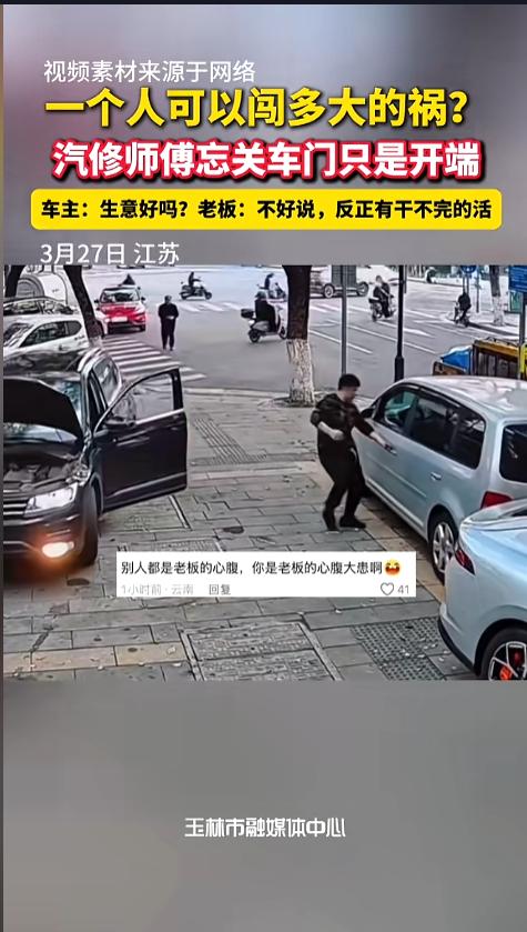 “这车是非撞不可么?”3月27日,江苏,一位汽修师傅开车时忘记关车门,险些剐蹭,老板眼疾手快将车门关上。谁知该师傅停车没拉手刹,就去开另一辆黑车了。结果溜车发生了碰撞。师傅紧急上前制止,结果黑车又溜车了!网友:怎么这么毛手毛脚的! 据媒体报道,当日,这位修车时候正驾驶一辆银色车往外走,根本没有注意到右后车门还开着。眼瞅着就要撞上旁边的车了,老板迅速飞奔上前,将车门关死,这才避免了剐蹭。 这位师傅将车停到了另一辆浅色车的前面,也没有拉手刹,就下车了。随后又开起了一辆黑色的车。就在这时,银色车发生了溜车,朝浅色车撞去。师傅和老板也发现了,赶紧上前制止,但仍然晚了一步,两车撞在了一起。 还没缓过神呢,黑车又开始溜车,朝前撞去,在两人的反应之外,直接撞上了。原来,这位师傅光顾着抢救银色车去了,下车又没拉手刹。这下好了,四辆车全部发生了碰撞,工作量大幅增加不说,还得赔钱。 网友看后表示,这好像黑瞎子掰玉米啊,掰一个扔一个。但人家手里最起码还留一个呢!他这个可好,一个都没幸免。看着好笑,实际可一点儿都不好笑。这根本不是粗心大意,这是违章操作,是极度缺乏安全意识。根本不顾自己和他人的生命财产安全,这样的人太危险了,可不敢让他从事这种岗位! 信息来源:《一个人可以闯多大的祸?汽修师傅忘关车门只是开端。车主:生意好吗?老板:不好说,反正有干不完的活。》玉林晚报
