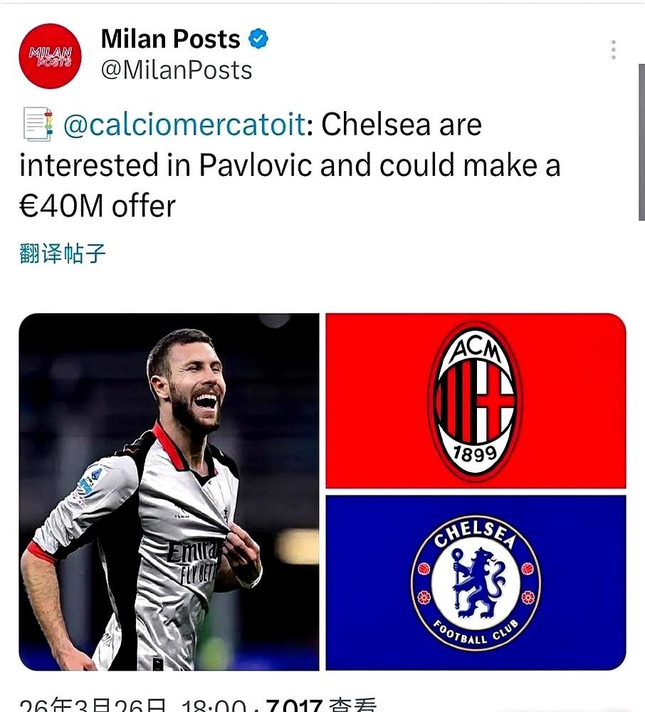 切尔西又来了,这操作真有点看不懂。 想买AC米兰的后卫帕夫洛维奇,直接甩出个4000万欧元的报价,结果人家米兰看都没看,直接回绝。 米兰的态度很明确:这小伙子是未来后防核心,至少值6000万,我们正忙着给他续约到2031年呢!这已经不是第一次了,之前买门将迈尼昂也是这个路数。 国际体育研究中心都给帕夫洛维奇估到5800万了,这价格开得确实有点不尊重人。 这到底是真觉得他不值,还是纯粹的砍价习惯?