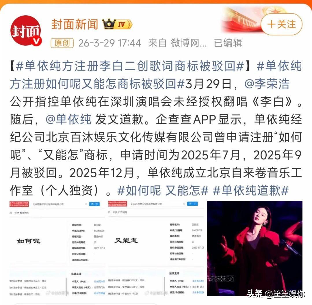 李荣浩死磕单依纯,根本不是小题大做。女方那边的公司早偷偷申请《李白》二创歌词商标,被驳回还不死心,明知授权被拒仍硬唱,把别人原创当流量跳板。 版权不是人情,是音乐人底线。一次是疏忽,次次是故意,这波站李荣浩,别拿年轻当借口。