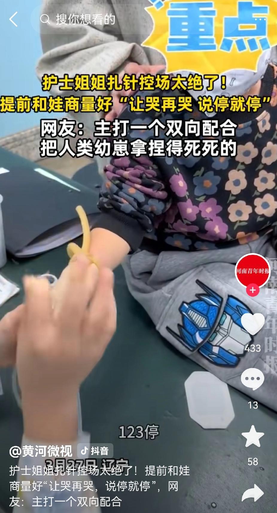 火到央视!沈阳儿科护士口令控场,萌娃打针说哭就哭说停就停[捂脸] 最近辽宁沈阳一位儿科护士直接火上央视,凭一套“口令式扎针”刷爆全网,看完又好笑又暖心! 谁家带娃没经历过打针名场面?娃哭到撕心裂肺,家长摁到满头大汗,护士也跟着着急。这位护士姐姐完全不硬来,蹲下来跟宝宝好好商量:“咱先说好配合我,没到哭的时候别先哭,我喊你再哭!” 小宝宝居然乖乖点头,全程听指挥。护士喊“123哭”,娃立马放声大哭;刚扎完一句“123停”,哭声戛然而止,配合得比彩排还丝滑,连护士都忍不住笑场,温柔安慰:“咱这配合,一点都不疼!” 网友笑称:这哪是护士,明明是儿科控场大师+幼师天花板,把打针玩成了小游戏,既快又不遭罪。 看似搞笑的背后,是满满的耐心和温柔。比起强硬摁住,这种尊重式沟通,既缓解孩子恐惧,也让家长松口气,这才是最棒的医护温度! 为这位暖心又有才的护士点赞,愿所有宝宝看病都能少点哭闹,多点温柔守护❤️ 儿科护士 萌娃打针名场面 人间温暖 你家宝宝打针是勇敢小勇士还是小哭包?评论区聊聊!