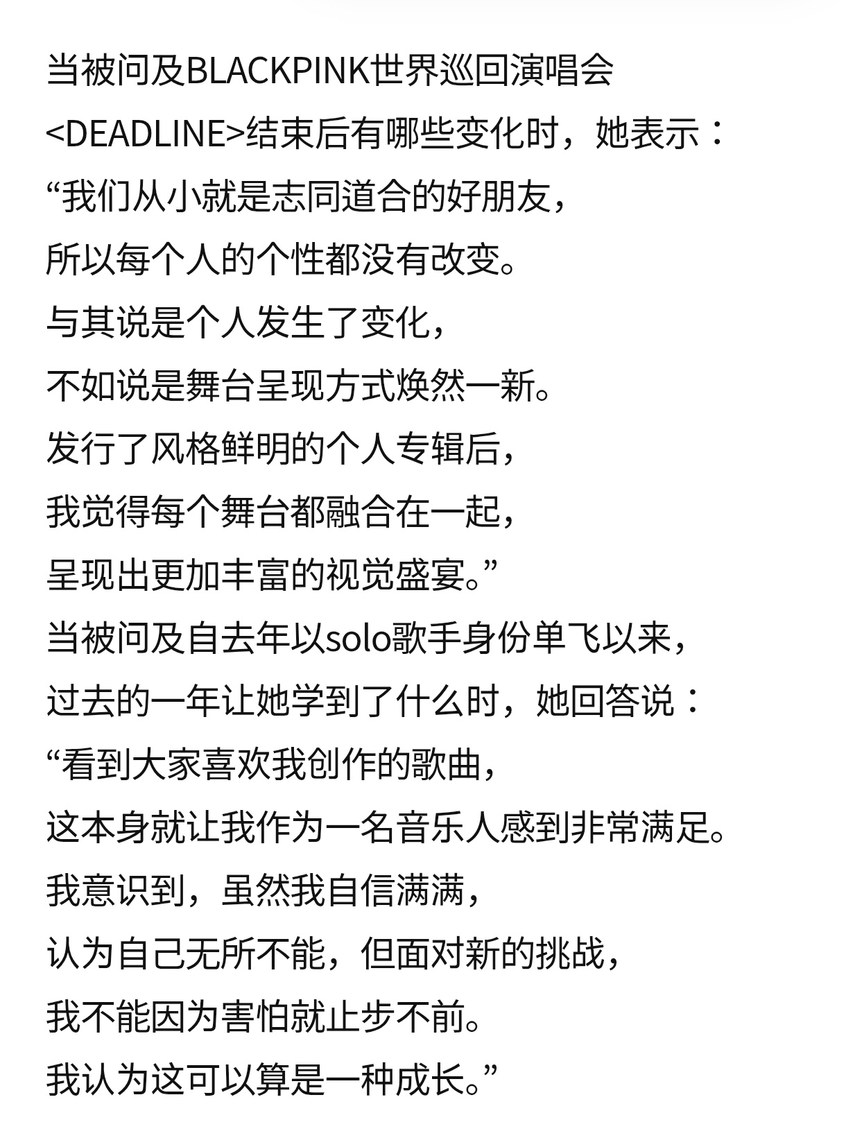 Jisoo for Bazaar Korea采访🐰当被问及BLACKPINK世界巡回演唱会结束后有哪些变化时,她表示:“我们从小就是志同道合的好朋友,所以每个人的个性都没有改变。与其说是个人发生了变化,不如说是舞台呈现方式焕然一新。发行了风格鲜明的个人专辑后,我觉得每个舞台都融合在一起,呈现出更加丰富的视觉盛宴。”