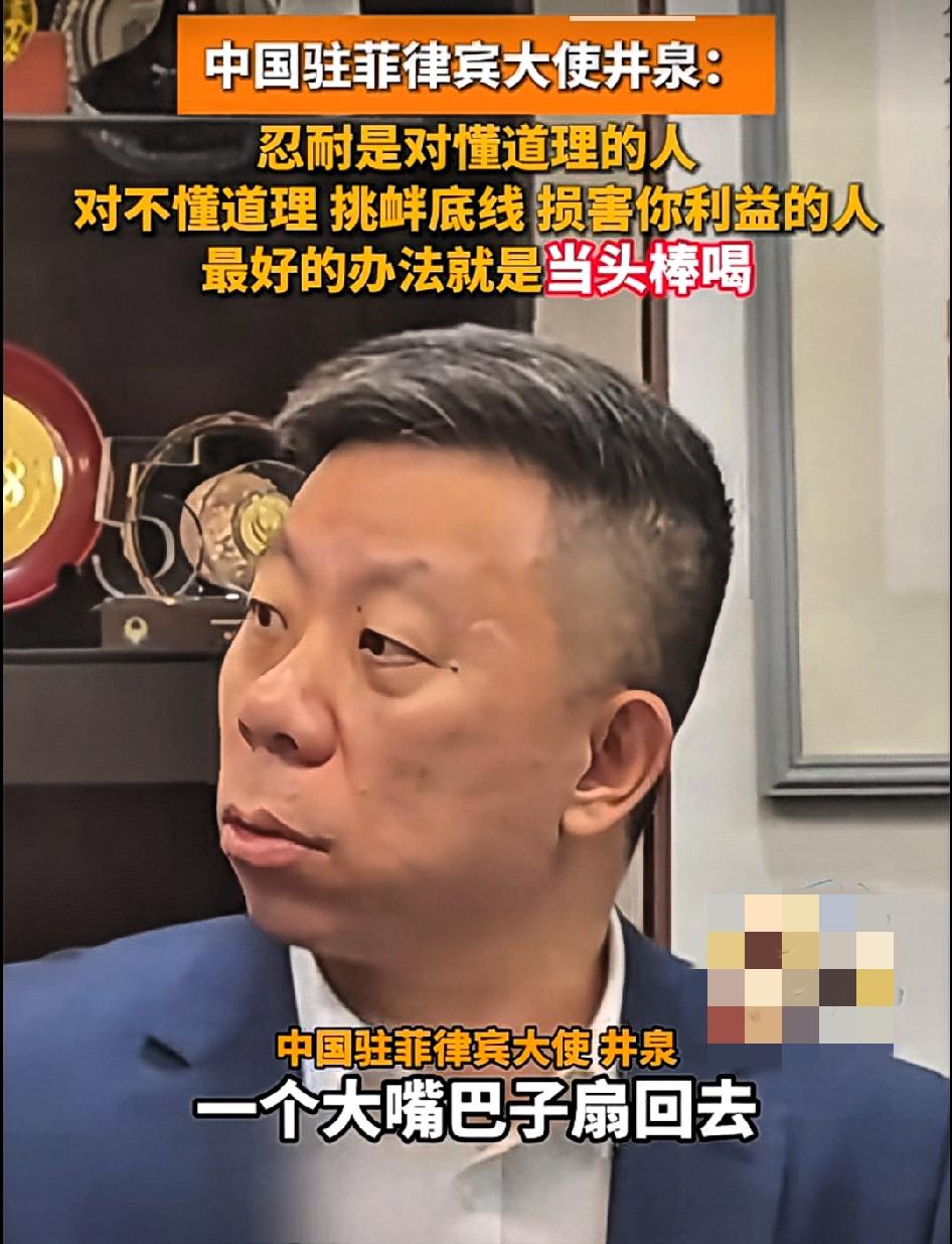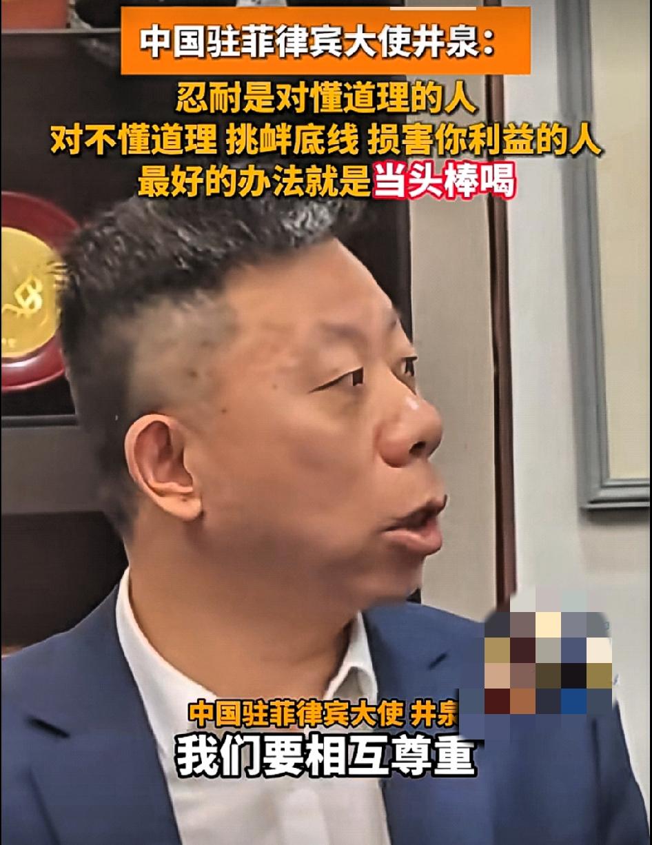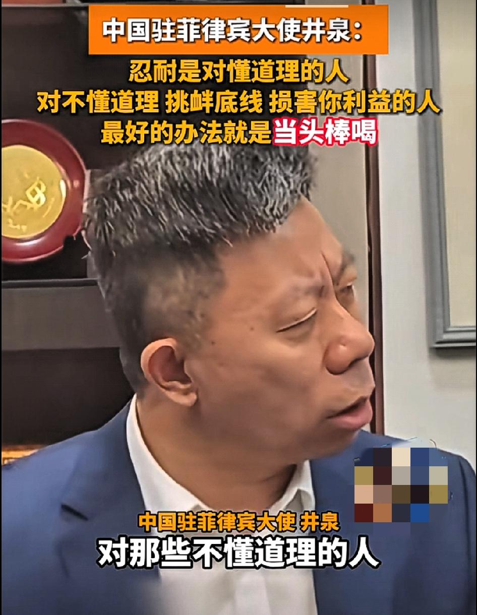 中国驻菲律宾大使井泉:我们的忍耐是对那些懂道理的人,要相互尊重,对那些不懂道理的人,忍耐只会让他不断挑战你的底线,不断损害你的利益。对这样的人要当头棒喝,打痛他是对他最好的教训。 评一下:井泉大使这番话,算是把外交辞令里那层“温良恭俭让”的窗户纸给捅破了。 翻译成大白话就是:我跟你讲理,是给你脸;你要是不识抬举,那我就得让你知道什么叫疼。 这背后其实反映了中国在周边外交,尤其是南海问题上心态的微妙转变。过去我们总讲究“顾全大局”,觉得忍一忍风平浪静,结果在某些国家眼里,这种克制成了“软弱可欺”,成了他们可以“切香肠”式挑衅的底气。井泉说的“忍耐只会让他不断挑战你的底线”,精准点出了这种困境——对于没有底线的人来说,你的宽容就是他得寸进尺的筹码。 所谓“当头棒喝”和“打痛他”,并不是喊打喊杀,而是一种博弈策略的宣告:用对方听得懂的语言对话。 有些国家只认实力,只有当他们切身的利益受损,感受到实实在在的反制代价时,才会把“相互尊重”四个字捡起来。 这话既是说给菲律宾国内某些政治势力听的,也是说给背后煽风点火的外部势力听的。简单总结:朋友来了有好酒,若是那豺狼来了,迎接他的就不再是忍耐,而是猎枪。 这种直白硬朗的表态,确实比那些四平八稳的“表示关切”看着提气,也更能让人看清红线在哪。