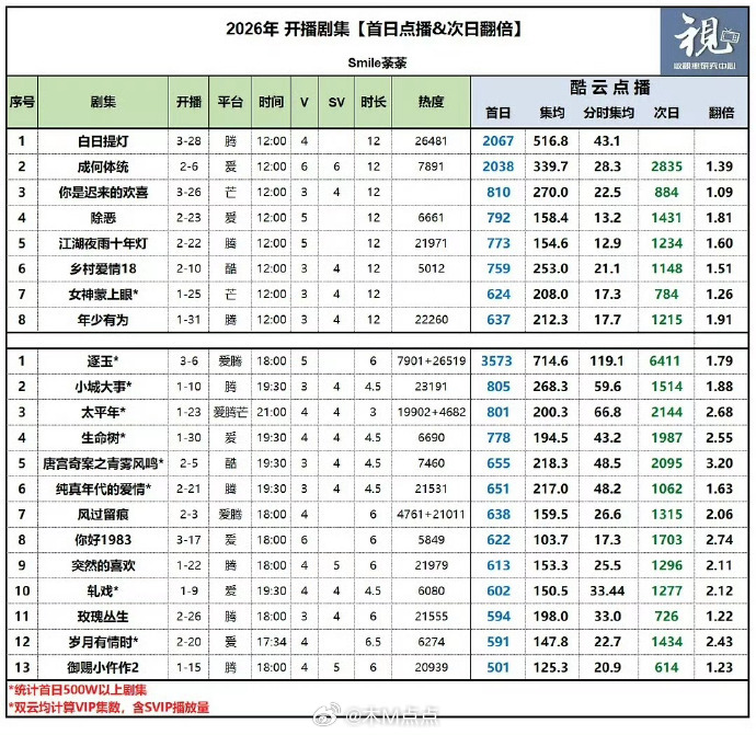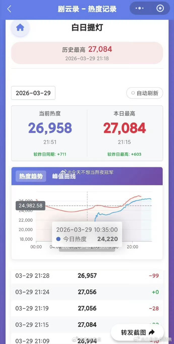 《白日提灯》🐧次日峰值27084,第二天播放指数超了逐玉~周一白天同期微📈20,数据很爆的!工作日真正的考验来了,如果不横盘,走势顺利的话破万日应该是在这周末。登顶第一,次日腾讯热度27000+,首日云合播放量2000w+爆开 白日提灯播放指数超逐玉