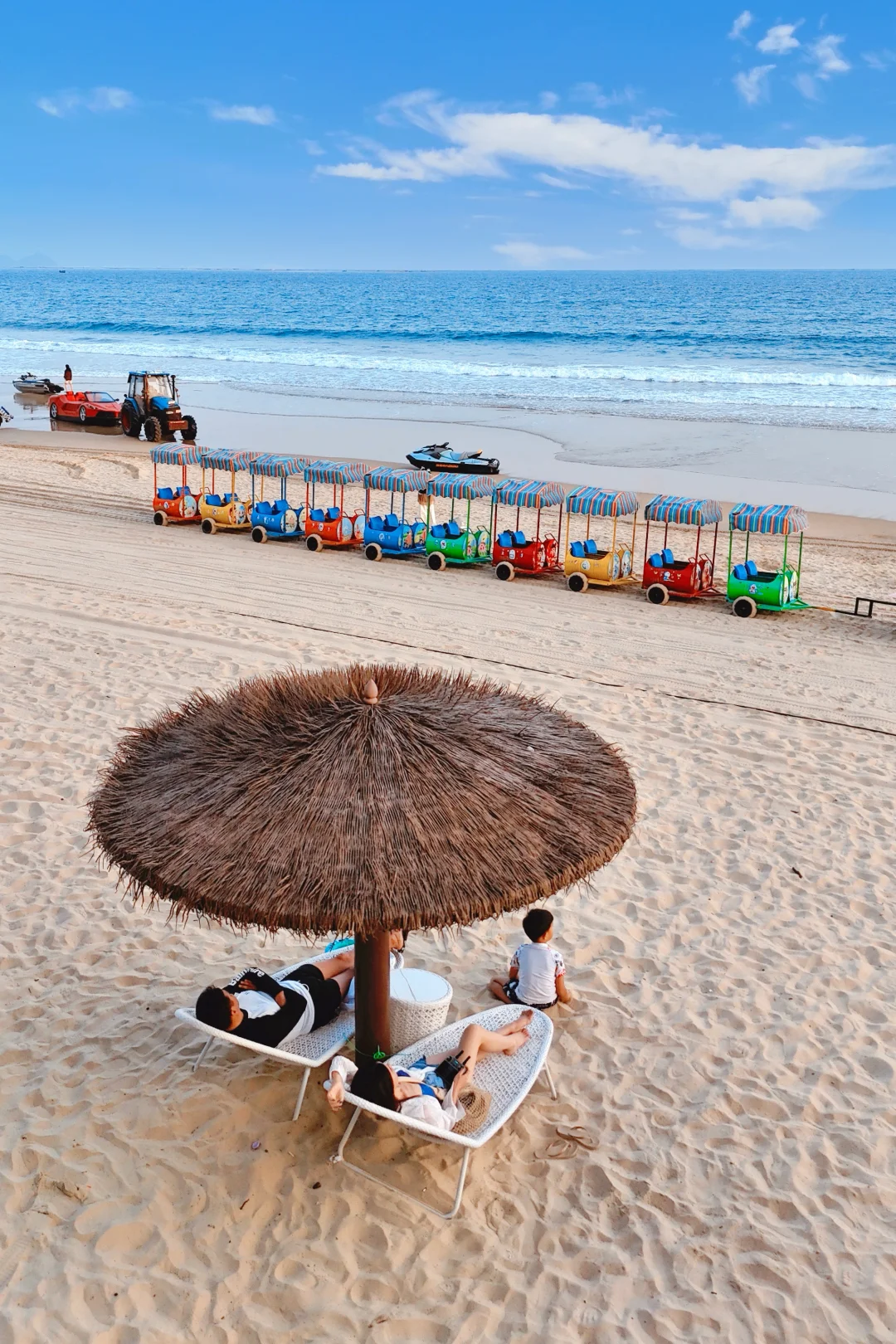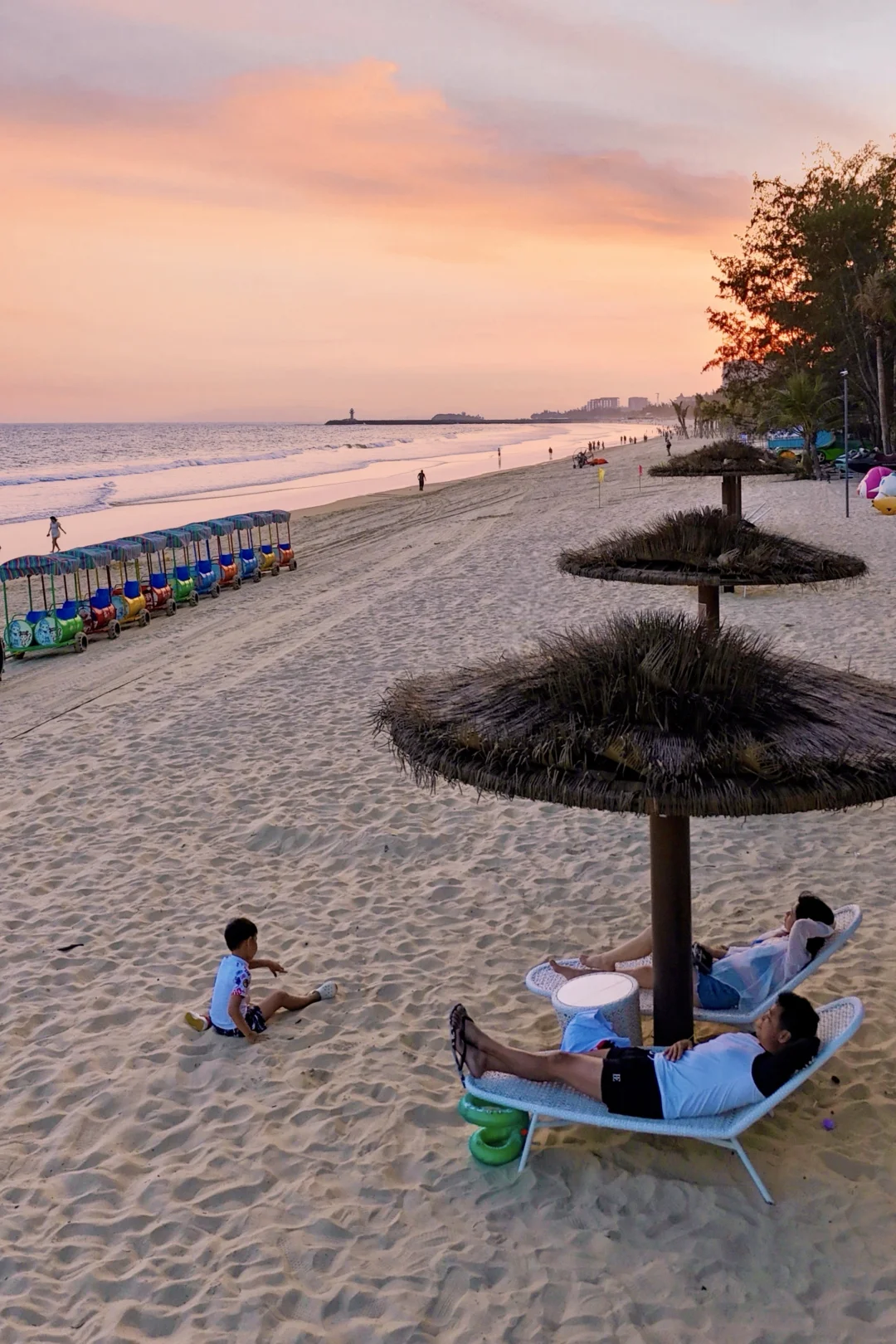 会唱歌的细软白沙滩,挖沙、玩水上项目、坐沙滩小火车,《消失的她》同款海上灯塔,灯塔上也有小火车,单程10r/人性价比不高,沿着海岸线可步行到龙头岭,赶海看日落一绝!