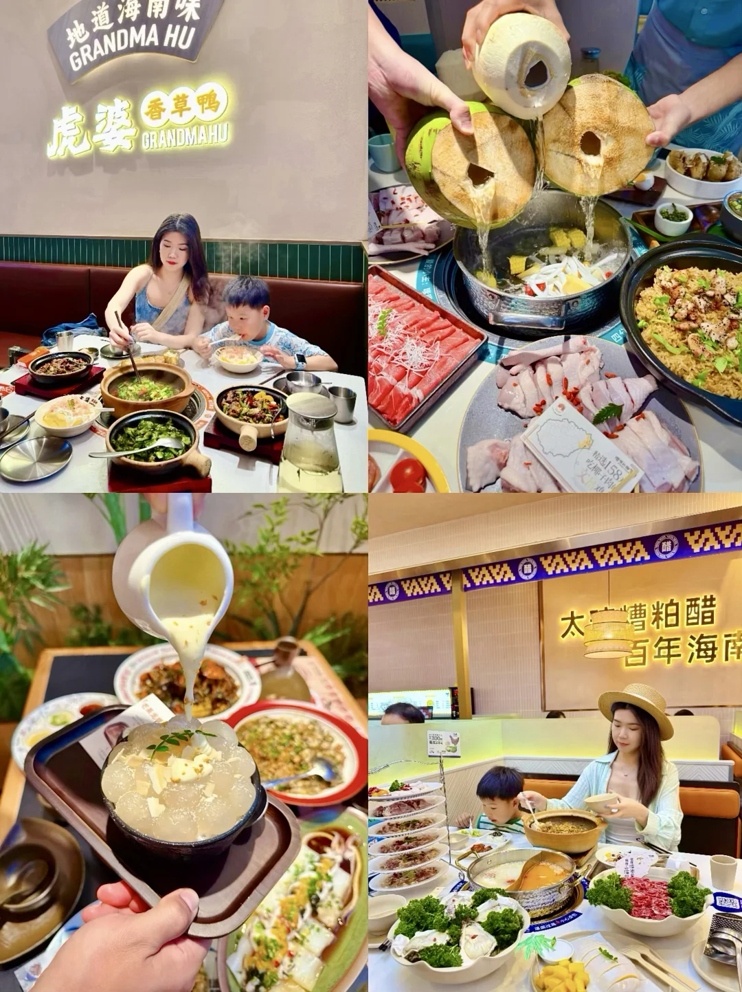 陵水本地美食有酸粉、香草鸭、椰子鸡、清补凉……我们带娃吃了太 琼糟粕醋火锅,涮海鲜酸甜微辣很开胃;嗲嗲 的椰子鸡,鸡肉被清椰汁煮的鲜嫩又清甜;虎 婆香草鸭,砂锅现炖的鸭肉软糯入味;87号 渔船海鲜,食材新鲜做法特别,蚝仔捞饭娃爱吃!