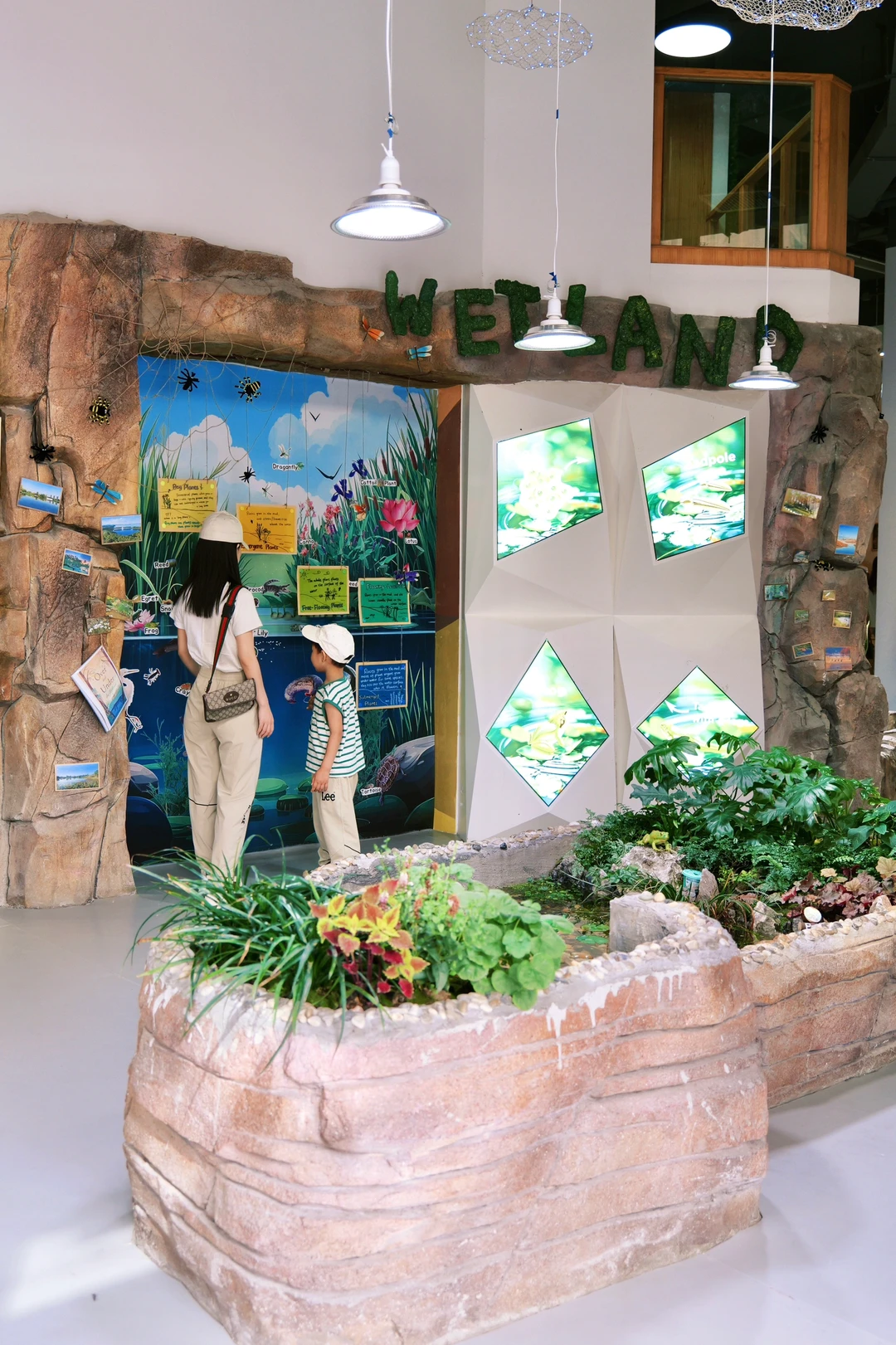 1、两千多平的校园,有热带雨林、湿地城市、沙漠地区三大主题,还有陆地动物、植物、海洋生物,每一个小动物都和娃们一样,有自己的名字哦,动植物还有老师手工制作的互动科普卡,在探索中培养兴趣。