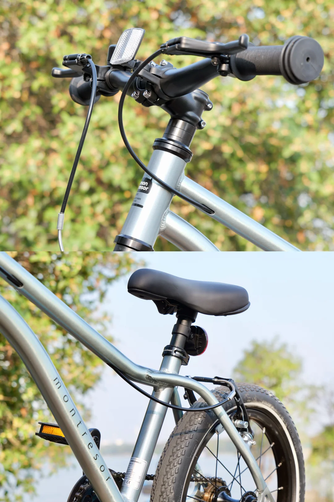 🔷除了低阻力,还有全地形轮胎,设计的小燕把手、反光条,赠的前后灯,也保障了孩子骑行的安全。