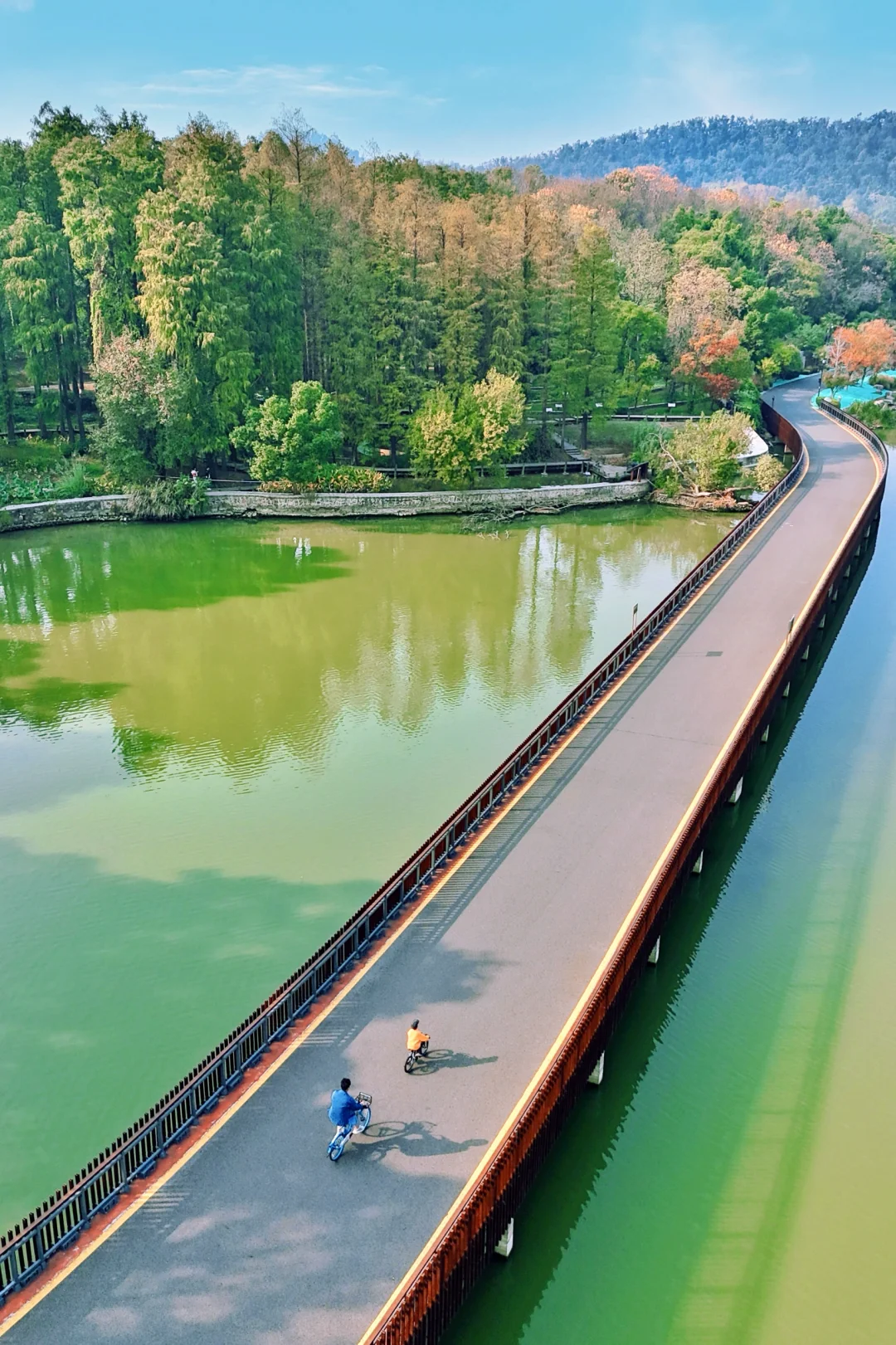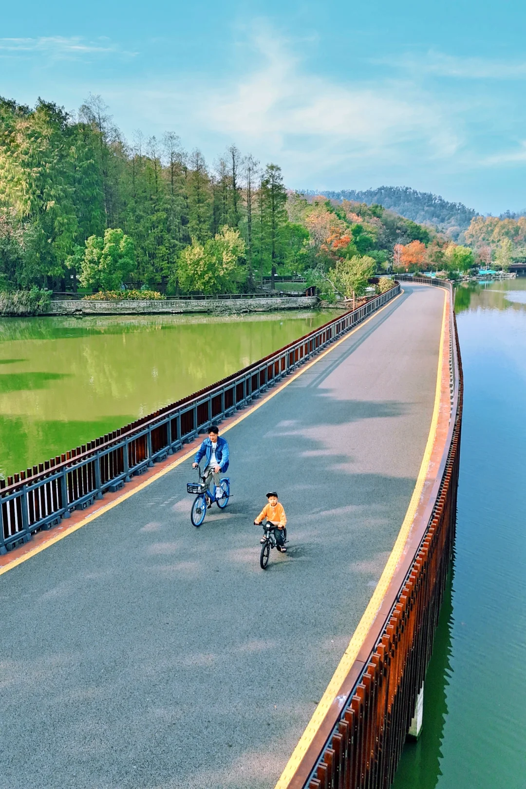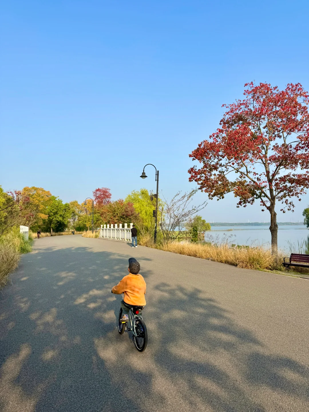 🍂一路上美景令人心旷神怡,黄+红搭配的树叶,秋日氛围感拉满,天气好的时候碧波桥仿佛海上栈道,还有柳条翩翩~