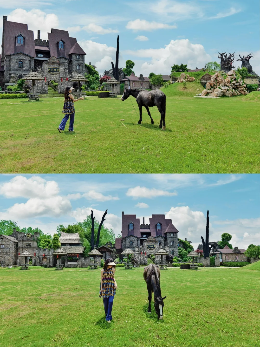 从来没见过这么混搭风格的建筑群,又中式又东南亚,又古典又现代,一砖一瓦一雕像都能看出古老的神秘感, 往里走还有古代村落和法式小镇的混搭,太小众了吧,建造这里的人得拥有多么有趣的灵魂。 哦对了,还有一整片绿油油的草坪,草坪上竟然还有动物园,投喂的食物卖的很便宜,离开的时候才知道门口两座厂房是博物馆+影视基地。 嘉鱼光年城堡,武汉周边开车1h,适合露营、拍照、遛娃、遛狗,就喜欢这种没人的地方,附近还有一家餐厅是上了舌尖上的中国的,好吃不贵,下次还来。