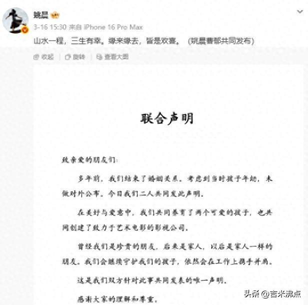 姚晨和曹郁离婚才11天,前夫就和她爸一起开公司,这事儿到底图啥? 最近刷到好几条新闻,说姚晨和曹郁3月16号发声明,说其实早就离婚了,只是以前为了孩子没公开。结果3月20号,他们俩就合伙注册了一家新公司,名字叫龙悦映画(泉州)影业有限公司。法人是姚晨她爸姚辉岩,占70%股份,曹郁占30%,注册资本50万。不是皮包公司,业务写得清清楚楚:电影制片、摄制、演出经纪、文化活动组织——全是实打实要干活的活儿。 这家公司不是突然冒出来的。早在2016年,姚晨和曹郁就一起创办了“坏兔子影业”,当时两人就是核心搭档。后来2023年,法人变成姚晨她爸,但曹郁一直没退出,还在2025年跟姚晨一起当制片人做了电影《生息之地》,还拿了柏林电影节银熊奖。所以这次新公司,更像是老合作的延续,不是临时起意。 有人觉得怪,离婚了还一起做生意?但仔细看,曹郁是摄影指导出身,专业能力摆在那儿,姚晨是制片加主演,把控内容和资源,她爸负责法人和资本层面的事。三个人分工挺清楚,曹郁不插手日常管理,姚晨也不直接管公司账,姚辉岩站前台,但实际决策还是三人共商。这不是靠感情维系,是靠多年合作磨出来的信任和默契。 这行本来就不容易,拍一部电影动辄两三年,从找钱、选角、拍摄到后期,哪个环节出岔子都可能砸掉。能继续合作,说明彼此靠谱,专业上认得清对方的分量。比起演恩爱或者互相拉踩,这种把事儿干成、话不多说的节奏,反而更实在。 姚晨在早前一次采访里说过,婚姻是人生一段路,走完了就走完了,但工作是另一件事。曹郁现在是奥斯卡评委,作品说话,不需要靠前妻名号。他们联合声明里也写了,孩子一起养,工作也继续合作,没藏着掖着,也没画大饼。 工商信息网上一查就清楚,龙悦映画注册时间、股东、经营范围全公开。姚晨微博和曹郁微博3月16号下午同步发了那条声明,一个字没多写,也没煽情。该办的手续照办,该推的项目照推。 体面不是装出来的,是事事有交代,件件有落实。 姚晨她爸和曹郁,现在就是两家公司股东。 一家叫坏兔子,一家叫龙悦映画。 两块牌子,一件事。