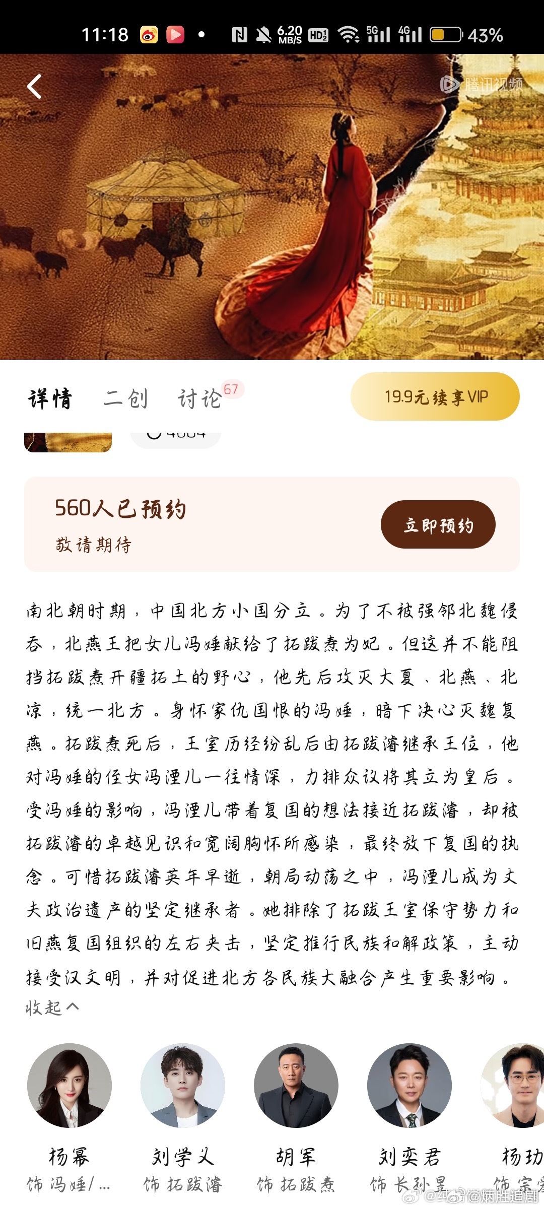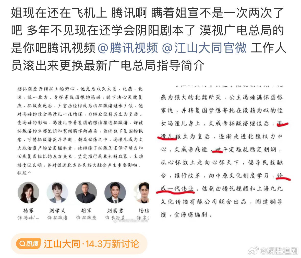 江山大同今日官宣阵容,网友发现在腾讯视频的简介遭“魔改”,和当时备案最新版本的简介对不上 。 杨幂新剧演冯太后