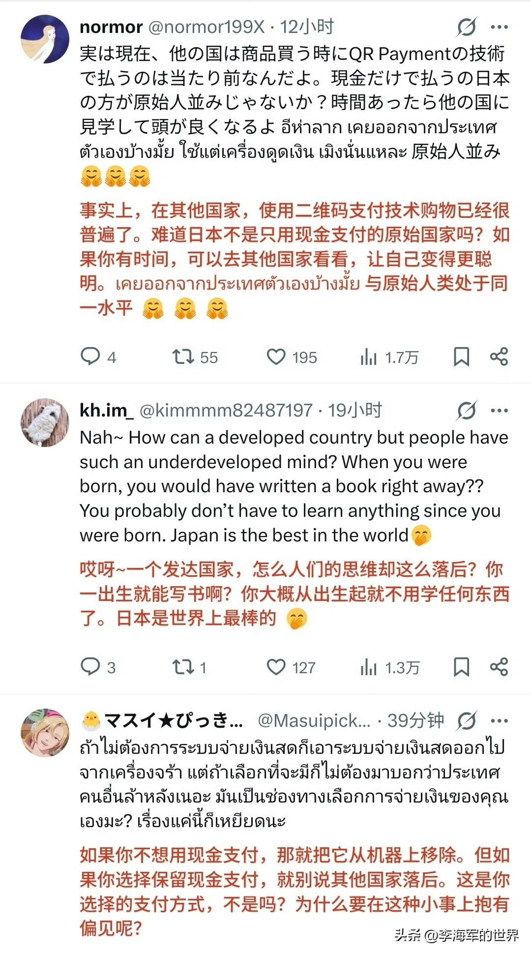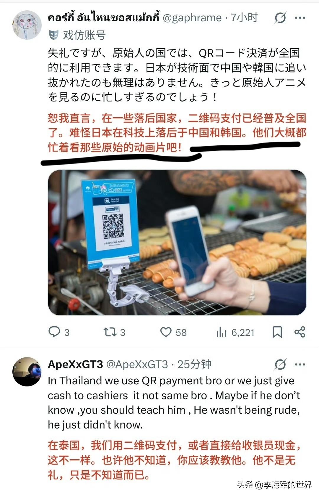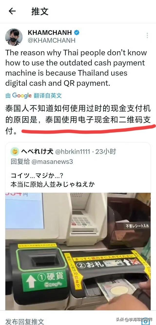 日本人网上嘲讽泰国游客不会用“先进”的现金支付机,结果被泰国人回怼“我们用电子支付!” 还有泰国人讽刺日本人“原始人笑别人不会钻木取火。” 不得不说,泰国人回怼日本人太到位! 能把佛系的泰国人惹恼,日本人也是没谁了。 众所周知,二维码的原形是源自日本人发明,但奇怪的是日本并没有在接下来有所创新,反而是在中国发扬光大。 还有那个传真机、A盘,国内基本淘汰掉了,但在日本依旧是大众化。 说个冷笑话,日本发达国家! 然而就是日本这个发达国家,却一直用着几十年前的物件不愿换新。 当外面的新生事物越来越多,变化也越大,但在日本却丝毫感受不到外界对日本的影响,就像生活在几十年前一样,一成不变,日复一日,过着以往的生活。 日本这样,与其说是守旧,不知变通,还不如说是日本社会缺乏进步,变革的带头人。 因为日本社会阶级是固定的,除非上层社会有意改革变动,否则下层社会是没能力,也没那个意愿去变动的。
