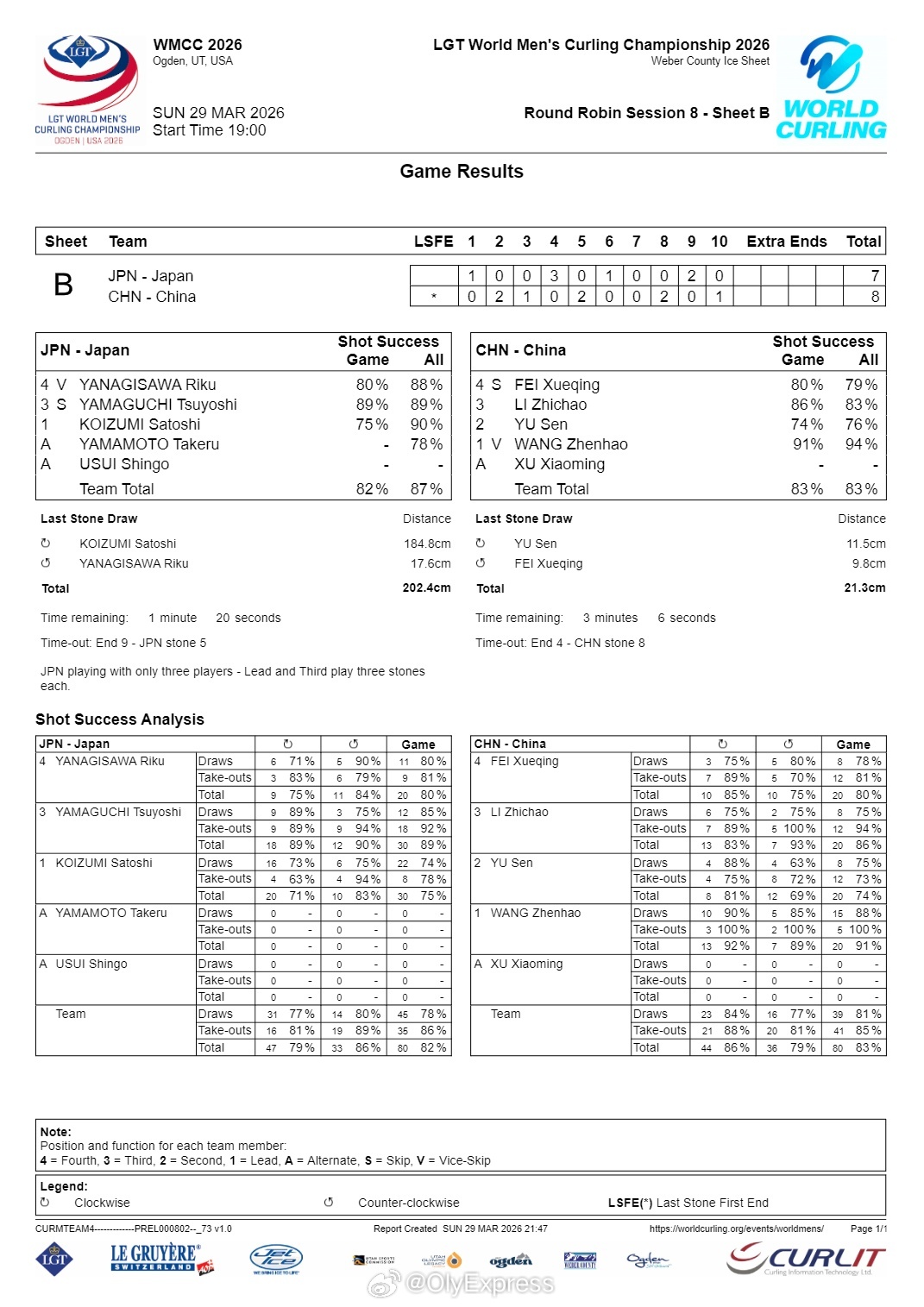 【男子冰壶世锦赛中国有惊无险8-7击败日本】2026男子冰壶世锦赛 3月29日美国奥格登,男子冰壶世锦赛循环赛,中国队在第五场比赛中8-7险胜3人出战的日本,目前3胜2负与德国、意大利和苏格兰并列第三。本场比赛双方小失误不断,中国队甚至出现了击打溜壶的低级失误。在7-7平后手进入第十局后,中国队稳扎稳打,以8-7拿下第三场胜利。北京时间31日4时和23时,中国队将分别对阵实力强大的瑞士和加拿大。