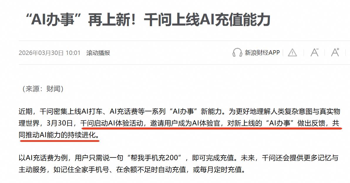 请用户当“AI训练师”?这思路挺有意思! 说实话,现在的AI处理标准指令没啥问题,但现实生活却没这么简单。 你跟AI说“帮我叫辆车,司机开稳一点”,它能不能理解?你说“帮我充50话费”,它会不会搞错号码?这些细节,光靠工程师在实验室里想是想不出来的。每个人的说话方式、隐藏需求、突发状况,AI根本学不完。 千问最近上线了AI打车和AI充值两个新能力。打车能听懂“要空气清新车”、“驾驶平稳”、“中途接个人”这种复杂需求;充值只要一句“帮我手机充200”就能搞定。但千问自己也清楚,想让AI真正在现实世界里帮人办好事情,必须靠真实用户的反馈来纠正它的决策偏差。 所以3月30号到4月6号,他们搞了一个AI体验活动。每天前100万登录用户可以直接领12元打车体验金和5元充话费体验金。用完之后,你对这两个功能做个评价反馈,千问再送你2张12元的AI打车体验金。 说白了,就是请你来当“AI训练师”。你每提一个建议、每吐槽一个不好用的地方,千问就改进一点。以后它办事越来越靠谱,这里边也有你的一份功劳。 有体验金拿,又能推动AI进步,我觉得这活动挺值得参与的。而且这种通过真实用户反馈来迭代AI的方式,比工程师自己琢磨要有效得多。 毕竟AI最终是要服务人的,咱们的真实体验才是最好的检验标准!