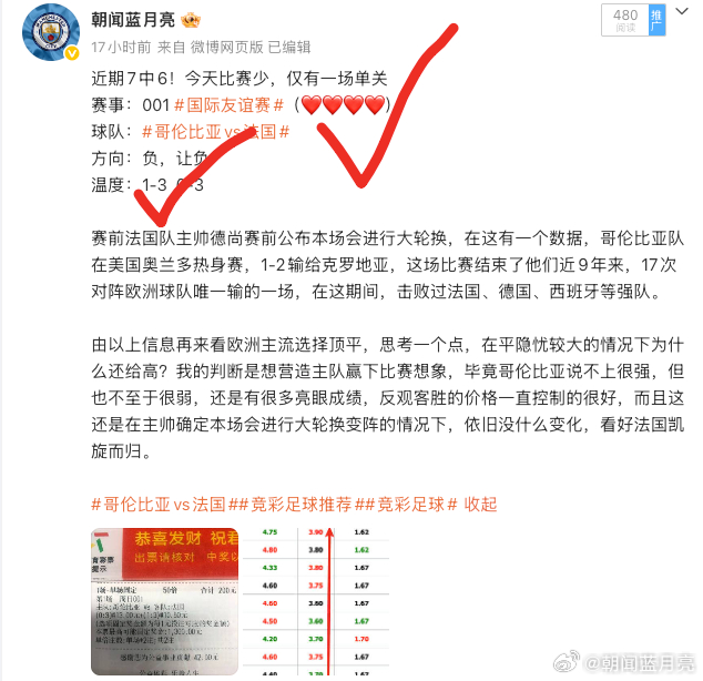 单关方向、比分都双双命中!!!!!!喜欢这种一早醒来看到如自己想法打出,微风拂面,去上班的路上风都是甜的,谁能懂这种感觉啊!哥伦比亚vs法国2026美加墨世界杯