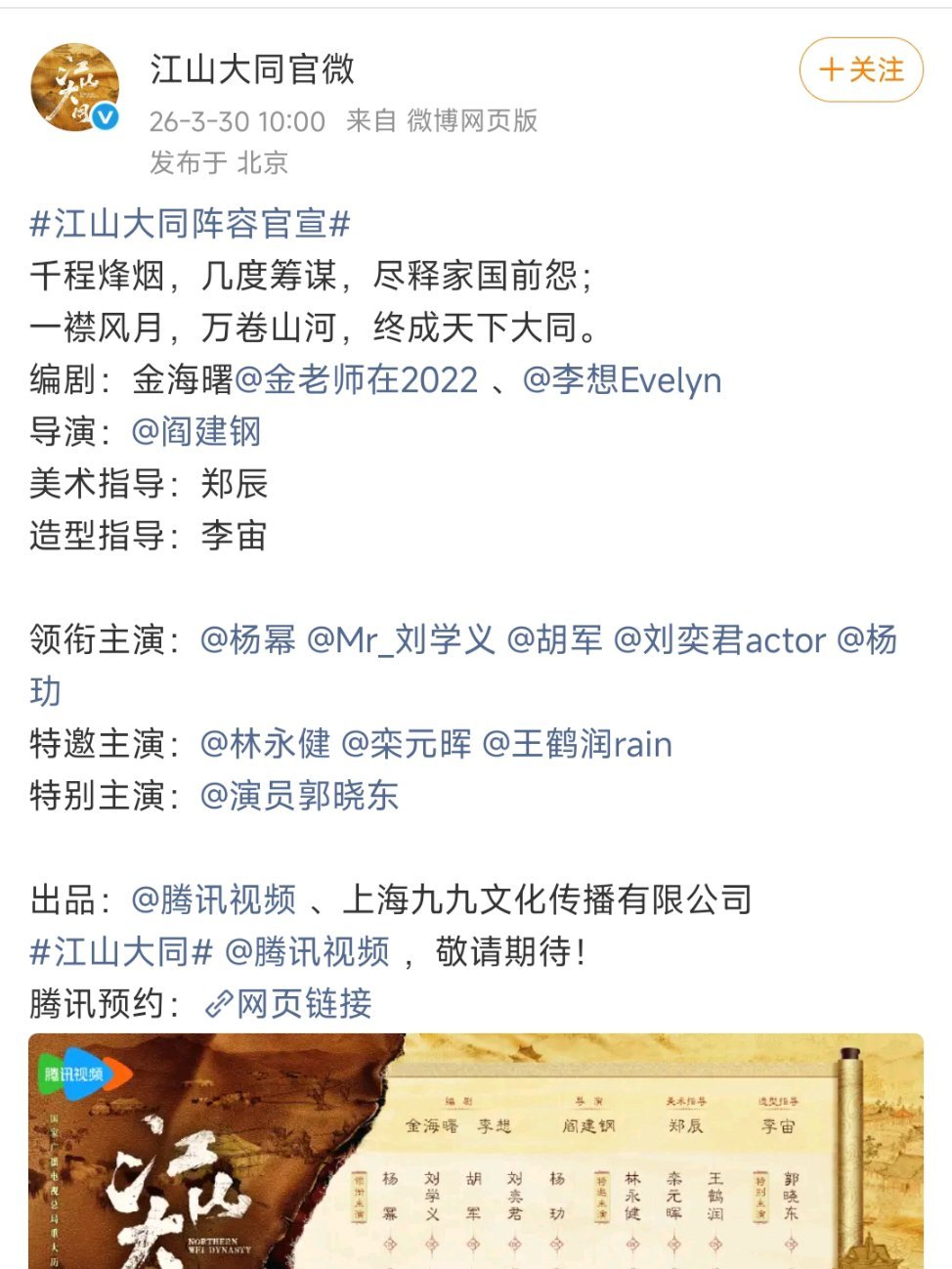 江山大同阵容官宣哇好突然官宣!我才知道杨幂居然在江山大同里一人分饰两角,贯穿全剧,好想看杨幂的千古一后冯太后!!!!!