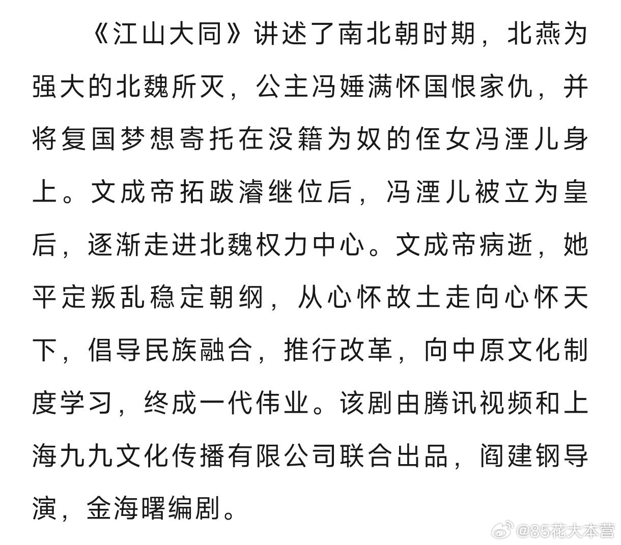 其中明确——《江山大同》讲述了南北朝时期,北燕为强大的北魏所灭,公主冯娷满怀国恨家仇,并将复国梦想寄托在没籍为奴的侄女冯湮儿身上。文成帝拓跋濬继位后,冯湮儿被立为皇后,逐渐走进北魏权力中心。文成帝病逝,她平定叛乱稳定朝纲,从心怀故土走向心怀天下,倡导民族融合,推行改革,向中原文化制度学习,终成一代伟业。
