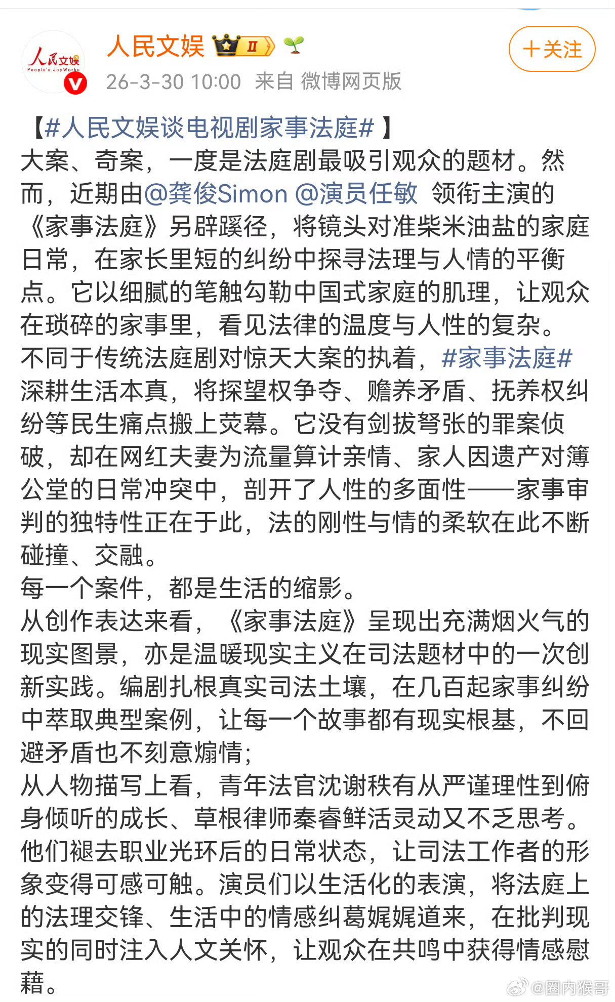 龚俊的家事法庭又被人民文娱表扬了!唯有扎根生活,读懂人心,才能让作品拥有直抵人心的力量。让观众在琐碎的家事里,看见法律的温度与人性的复杂。家事法庭今晚终于要恢复更新了