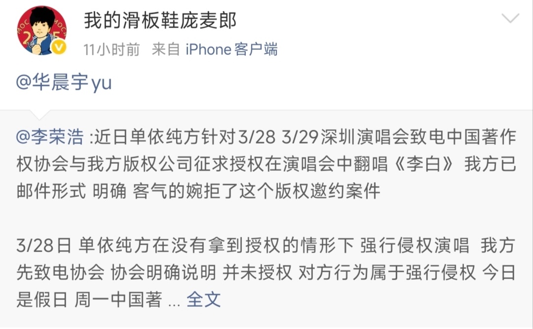 庞麦郎转发李荣浩微博并艾特华晨宇,两人之前因为《我的滑板鞋》版权问题有纠纷。