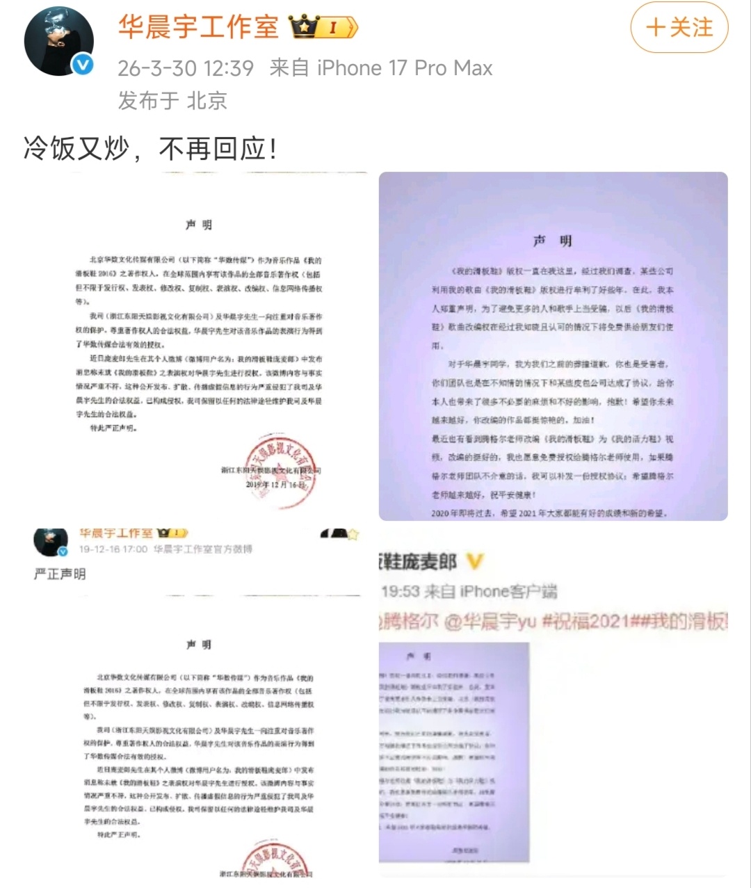 随后华晨宇工作室晒出了19年就回应过的授权声明以及庞麦郎的道歉声明,配文:“冷饭又炒,不再回应!”