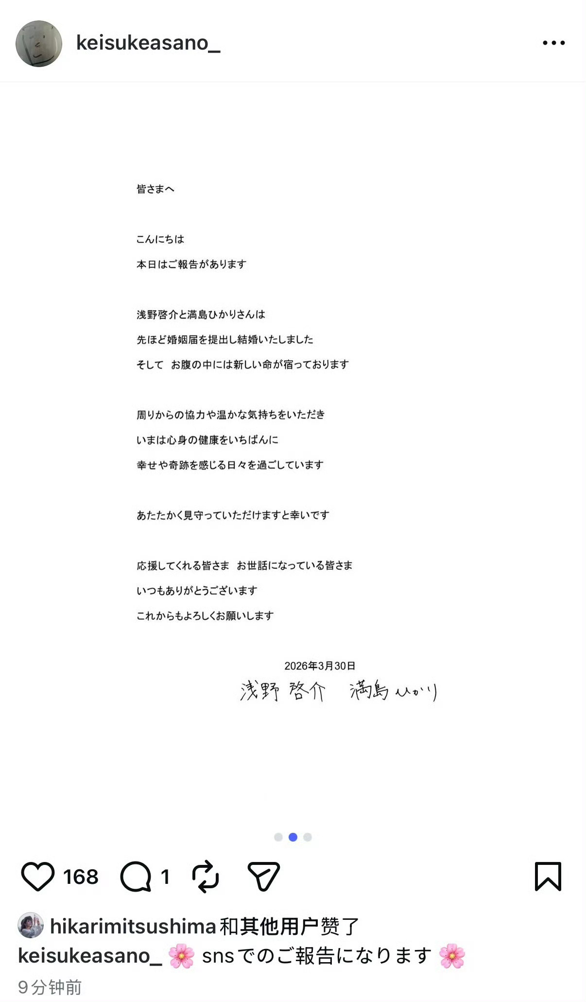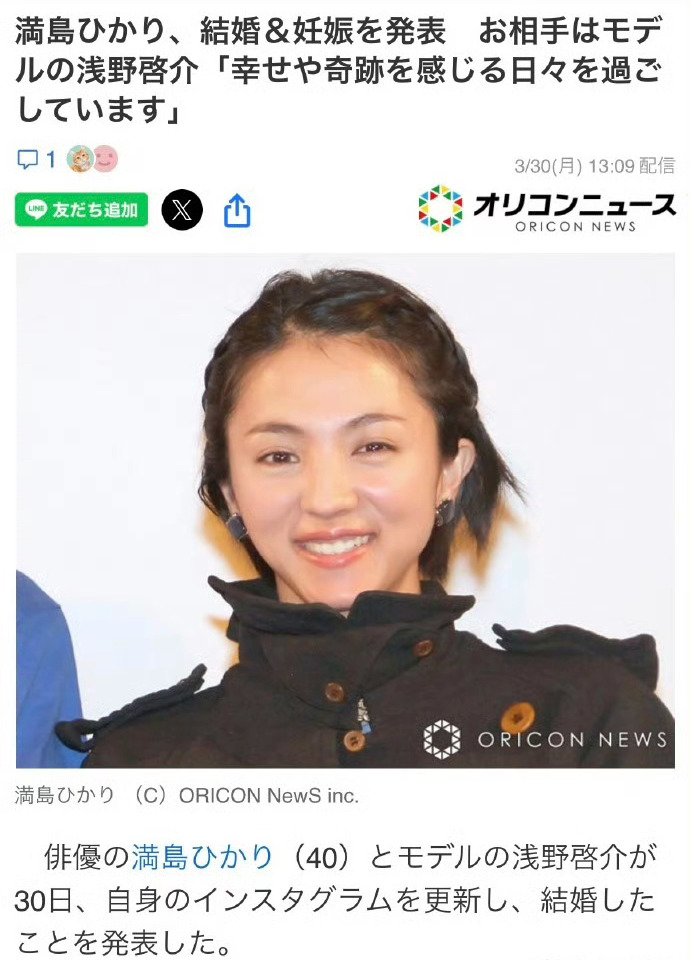满岛光宣布再婚且已怀孕,男方是日本当下人气较高的新生代模特浅野启介。两人在社交平