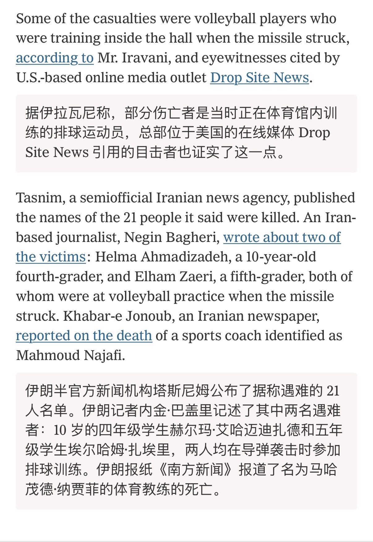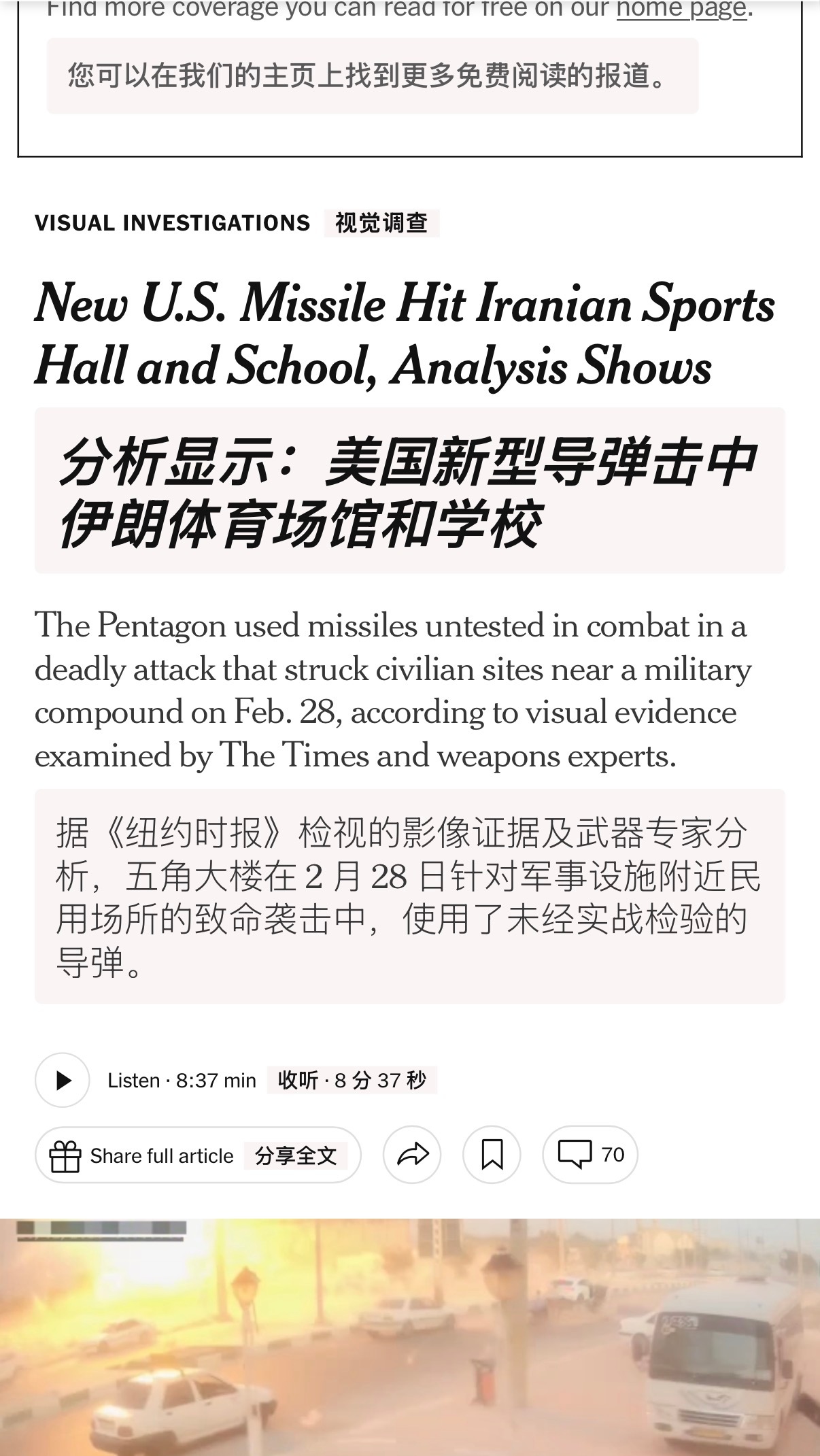 🔻纽约时报分析显示:美国新型导弹击中伊朗体育场馆与学校。🔻战争首日,美军向伊朗南部拉默德市一处目标发射了尚未经历实战检验的精确打击导弹PrSM。该导弹击中了正在训练的女子排球队所在的体育馆,以及毗邻的一所小学。🔻事件造成 21 人死亡、100 人受伤。遇难者包括一名正在参加排球训练的 10 岁四年级学生和一名高中生。🔻精确打击导弹在目标上空引爆后向外喷射钨合金弹丸。美国官员向《纽约时报》证实此次袭击使用了该型导弹。🔻就在同一天,美国的一枚战斧导弹击中了米纳布的一所学校,造成 175 人死亡。五角大楼的回应是:“美军不会不分青红皂白地以平民为目标。”伊朗称美停战建议涉伊朗基本权利美特种部队数百人抵达中东海外新鲜事中东现场直击