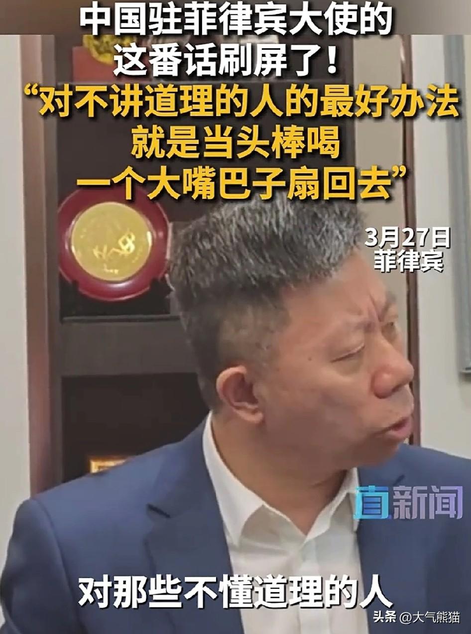 驻菲律宾大使的这段话彻底刷屏了! 对不讲道理的人应当头棒喝,这个大嘴巴子扇回去,这真的说出了大家的心声。 菲律宾一直在南海搞小动作,又是派飞机强闯黄岩岛,又是派军舰强闯美济礁,还不断派船只碰瓷中方巡航舰,炒作一些不实言论。 这次驻菲大使直接把话挑明,对于讲道理的国家,我们要保持相互尊重,但是对于一些不讲道理的,完全没有必要姑息,因为忍耐和克制只会使他不断挑衅我们的底线,损害我们的利益。
