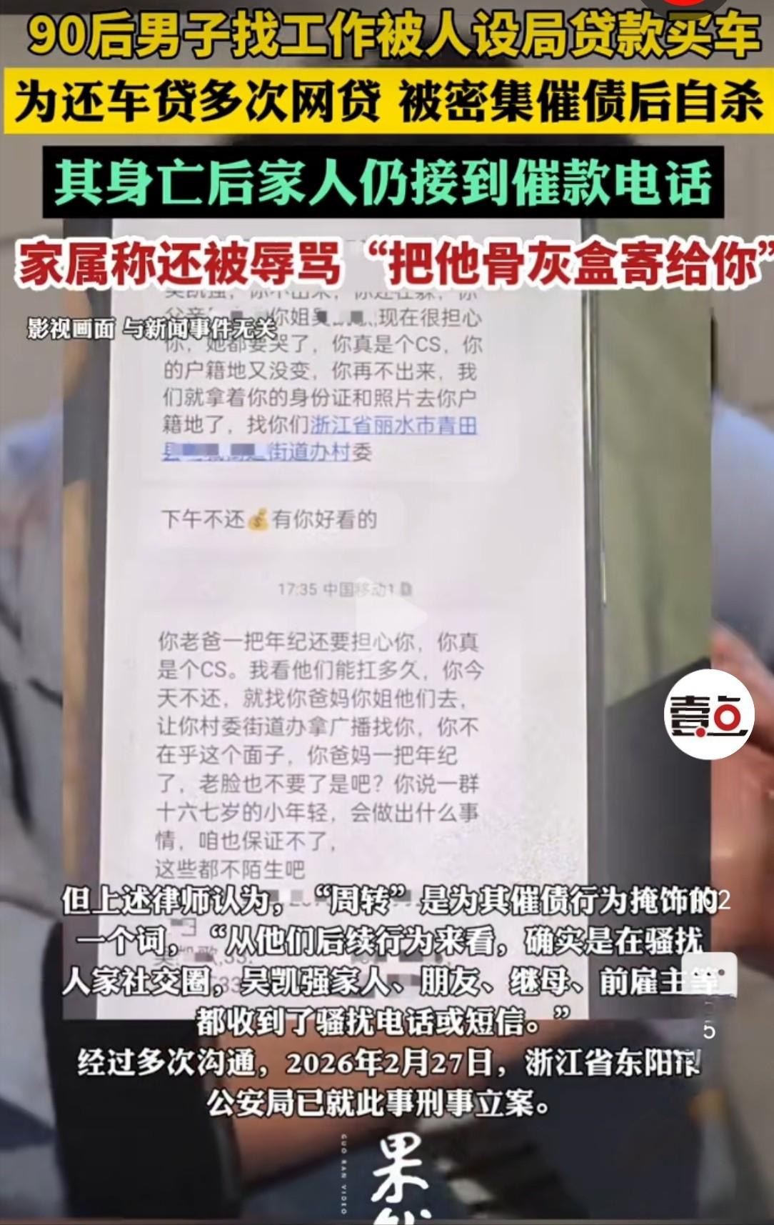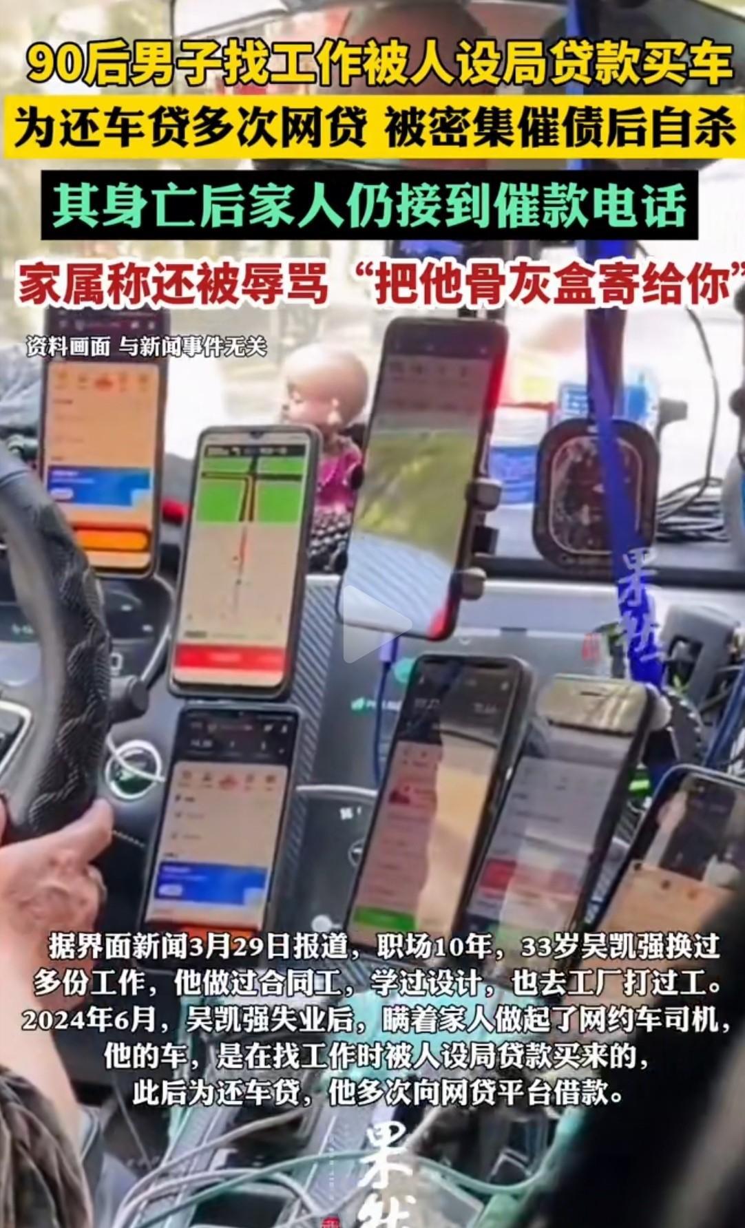 浙江东阳,33岁的男子,在母亲长眠的公墓旁,在车里结束了生命。而悲剧的开始,以为能找到月入过万的司机工作,不料,却掉进了“贷款买车”的陷阱,最终男子被无休止的催债,逼上了绝路。最让人难以接受的是,男子死后,家人还接到催收电话,被辱骂:“把他骨灰盒寄给你”。 吴凯强的人生,其实一直过得不算顺利。他今年33岁,身高1.78米,偏胖,戴着黑边框眼镜,性格有些内向宅家,平时喜欢吃美食、看二次元漫画和打游戏。 母亲过世得早,父亲性格严厉,他从小到大在工作上大多被动听从安排,换过好几份工作,做过法院合同工,学过设计,也去工厂打过工、做过仓管员。 每份工作都不算长久,收入也一直平平淡淡,心里一直盼着能找到一份稳定又高薪的工作,给家人争口气,也让自己的生活能好起来。 失业后的他,瞒着家人偷偷找工作,迫切希望能尽快找到一份收入可观的活儿,缓解经济压力。就在这时,某招聘平台上的一则司机招聘信息,瞬间吸引了他的目光。 那则招聘信息写得十分诱人,明确标注保底月薪1.2万,还承诺公司配车,不需要缴纳任何押金和保证金,不用自己花钱买车,只要有驾驶证、能开车,就能入职。 对于失业在家、急需一份稳定工作的吴凯强来说,这样的条件无疑是雪中送炭,他没多想,立马主动联系了招聘者。 联系上之后,招聘者态度格外热情,说话也十分客气,不停夸赞吴凯强条件合适,还一个劲地邀请他到东阳市面谈,说具体的工作细节,面谈时再详细说明。 还特意嘱咐他带上身份证、驾驶证和银行卡,反复强调“就带建行那张卡就行”。吴凯强满心欢喜,以为自己终于找到了心仪的工作,第二天一早就赶往东阳,赴约面谈。 可面谈的过程,却和他预想的完全不一样。招聘者全程只字不提保底月薪1.2万的工作细节,也不说具体的工作时间、岗位职责,反而拉着他不停看车,嘴里不停夸赞车子的性能好、适合跑营运。 还催着他签各种合同,一会儿让签车辆告知书,一会儿让签贷款抵押合同,全程语速飞快,根本没给吴凯强细看条款的时间,还不停催促“赶紧签,名额紧张,签完就能入职,下个月就能拿高薪”。 被高薪承诺冲昏头脑的吴凯强,没多想就按对方的要求签了字。等他签完所有合同,反应过来的时候,才发现自己名下莫名多了一辆价值14万的汽车,同时还背上了19万多的贷款。 工作人员这才告知他,贷款要分60期还清,每个月固定还款3194.82元,这一下,吴凯强彻底懵了,他这才意识到,自己可能被骗了。 他急忙找招聘者理论,询问当初承诺的保底月薪1.2万的工作在哪里,可对方的态度瞬间变了,再也没有了之前的热情,只敷衍地说,没有什么固定工作,让他自己注册网约车平台,去接顺风车单赚钱。 还说“多跑多赚,只要肯努力,月入过万不是问题”。到这时,吴凯强才彻底明白,所谓的高薪司机工作,根本就是一个幌子,目的就是骗他贷款买车。 更坑人的还在后面,吴凯强拿到车辆保险单后发现,保单上明确标注车辆使用性质为“非营业”,这就意味着,他根本不能用这辆车跑营运、接顺风车单。 一旦被交通部门查到,就是非法运营,罚款、扣分一样都跑不了,严重的还会被吊销驾驶证。这也就意味着,他不仅背上了高额贷款,连靠开车赚钱还债的路,都被彻底堵死了。 为了还清每个月的贷款,吴凯强只能硬着头皮偷偷接顺风车单,可收入却十分不稳定。有统计显示,他开顺风车的最高月收入只有4101元,最低的时候只有821元。 大多时候连3000元都赚不到,根本不够偿还每月3194元的贷款。没办法,他只能一次次向网贷平台借款,短短一年时间,就先后借贷了5笔,越陷越深。 随着贷款和网贷陆续逾期,催债电话开始源源不断地打过来,不分白天黑夜,不仅骚扰吴凯强本人,还给他的家人、朋友、前雇主甚至继母都打去了骚扰电话和短信,言语威胁、辱骂更是家常便饭。 那天,吴凯强接到了四通催债电话,压力大到崩溃,随后开车买了农药,把车停在了母亲长眠的松阳县某公墓附近。 夜里,他吞下农药,还在车内割腕,最终结束了自己33岁的生命。他曾在留给家人的邮件里写道,“我不想死,但自己扛不住了,我每天不停地开车,但他们还是不停地骚扰我,说要找你们,我真的很怕”。 可让人无法接受的是,他的遗体还没来得及好好安葬,家人就接到了催收电话,电话那头的催收人员,在得知吴凯强已经去世后,不仅没有丝毫歉意,反而恶语相向,辱骂道“把他骨灰盒寄给你”,字字扎心。 其实,吴凯强的悲剧并不是个例,近年来,这种以“高薪司机”为诱饵,诱骗求职者贷款买车的“套路运”骗局屡见不鲜。 不法分子成立空壳公司,通过招聘平台发布虚假信息,将入职与贷款买车捆绑,一步步诱骗求职者陷入债务陷阱,背后形成了一条紧密勾连的利益链,也给不少家庭带来了无法挽回的伤害。 信源:齐鲁壹点