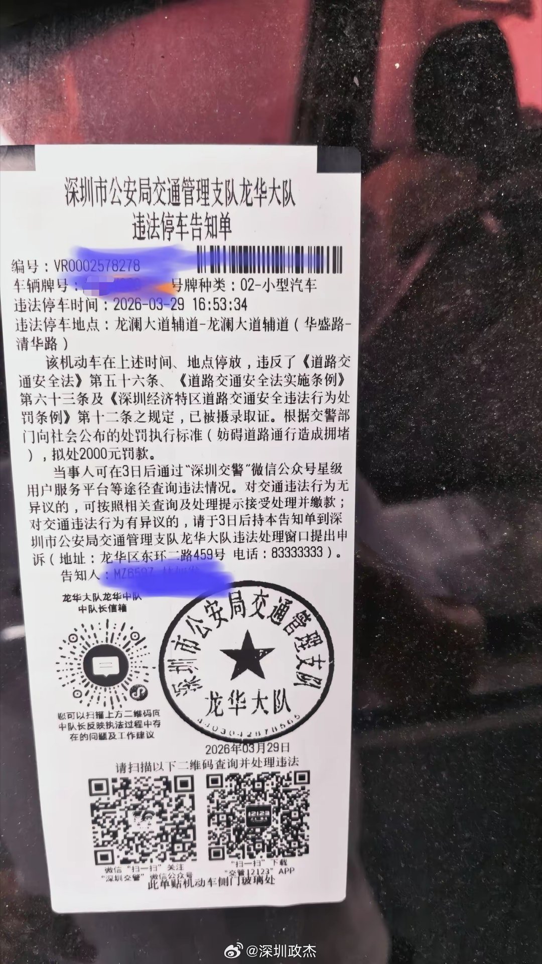 外地车来深圳乱停车,罚款2000元。